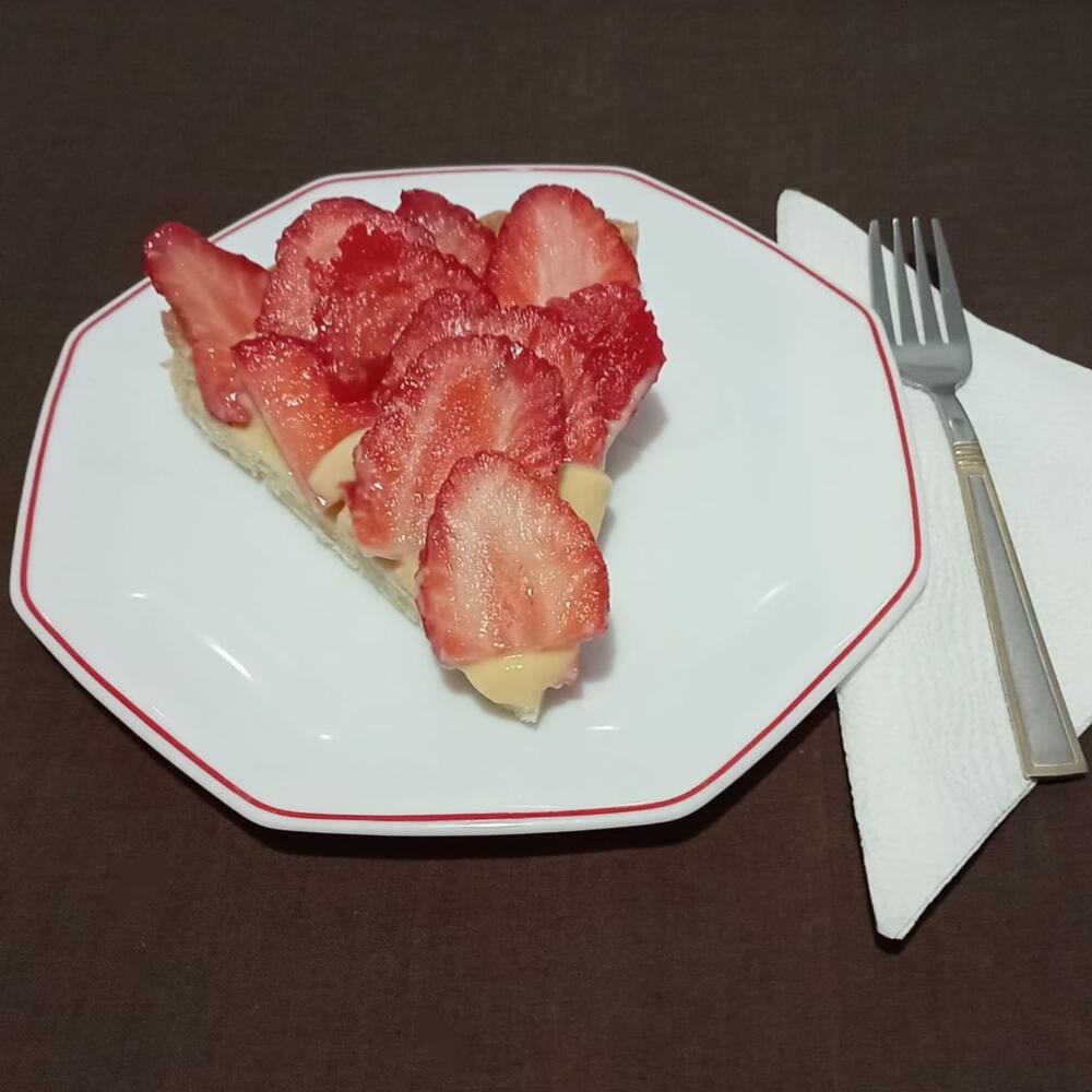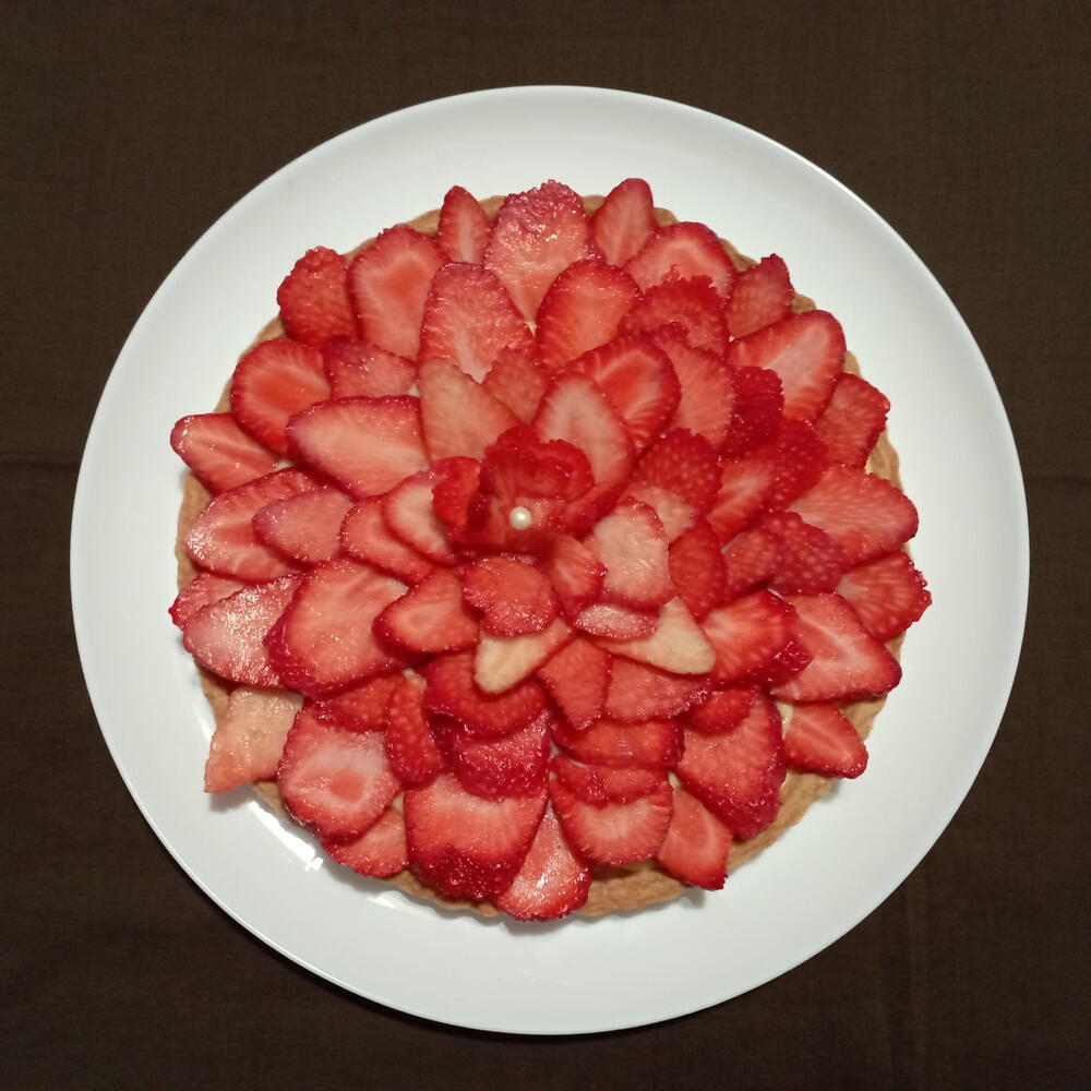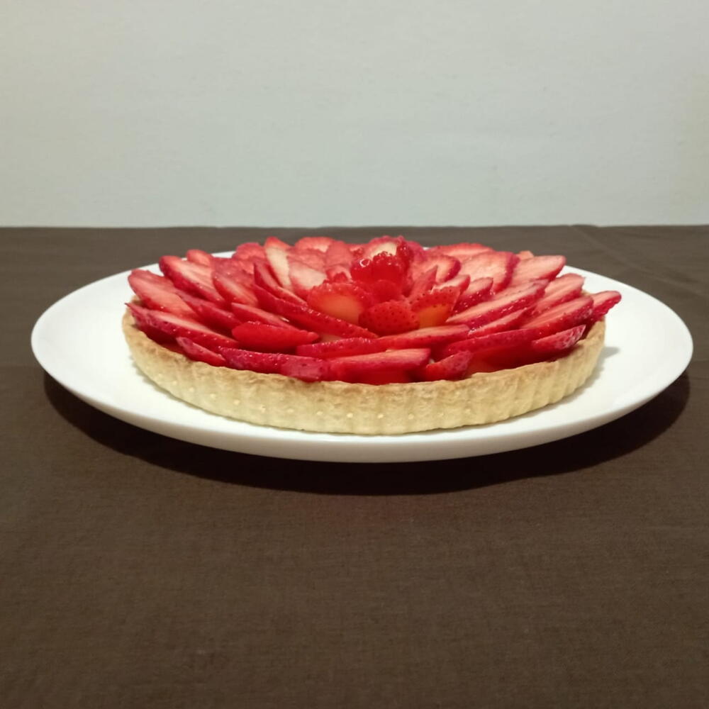 Esta exquisita tarta está elaborada con ingredientes de la más alta calidad. Compuesta por una base de harina, sazonada con azúcar y mantequilla, se realza con elevación proporcionada por los huevos y suavidad por la fécula de maíz. Su sabor incomparable viene de la leche y el extracto de vainilla, añadiendo una dulzura sutil. Pero el verdadero protagonista aquí son las fresas frescas y jugosas, que le dan a nuestra tarta su nota característica y vibrante. Un verdadero placer dulce para los sentidos.