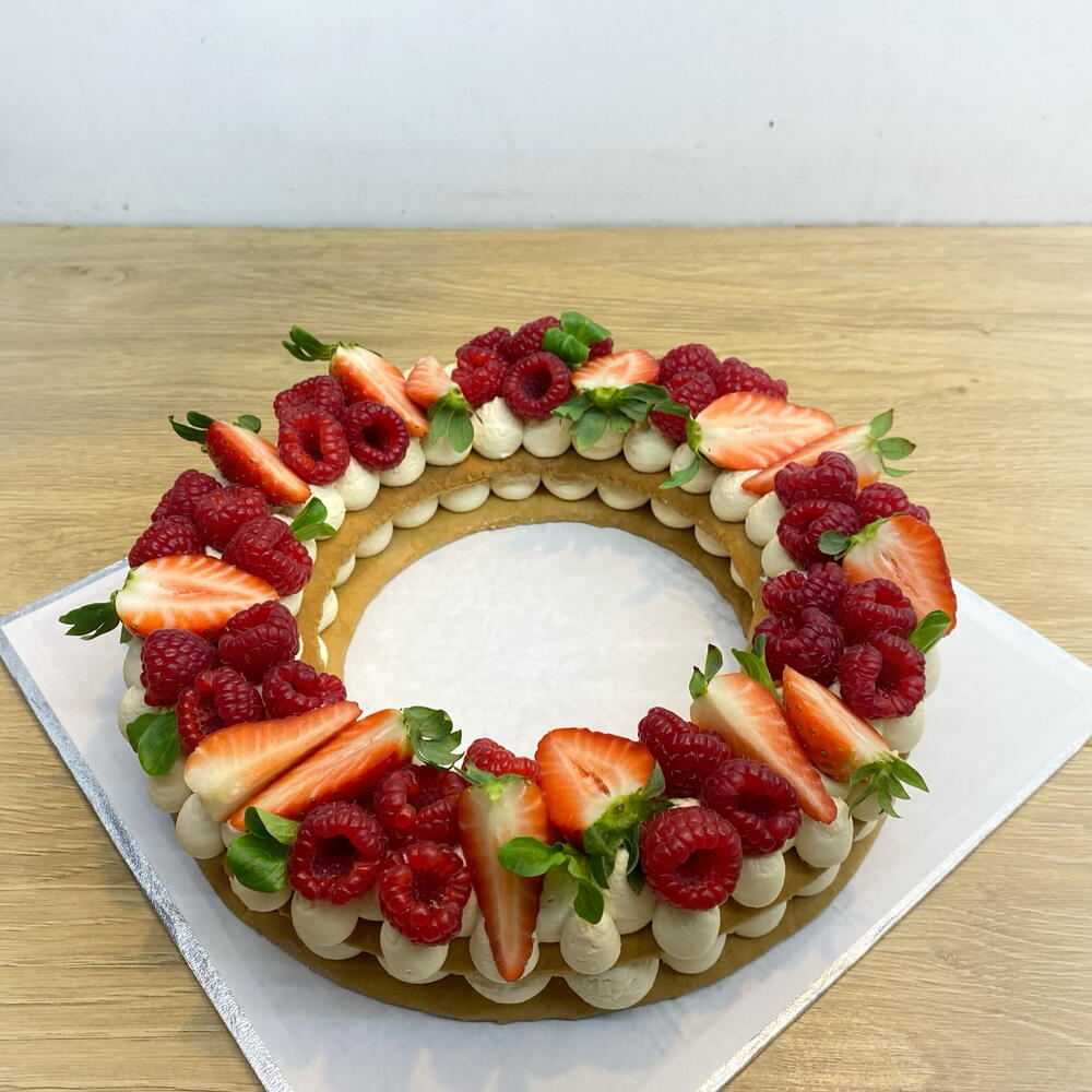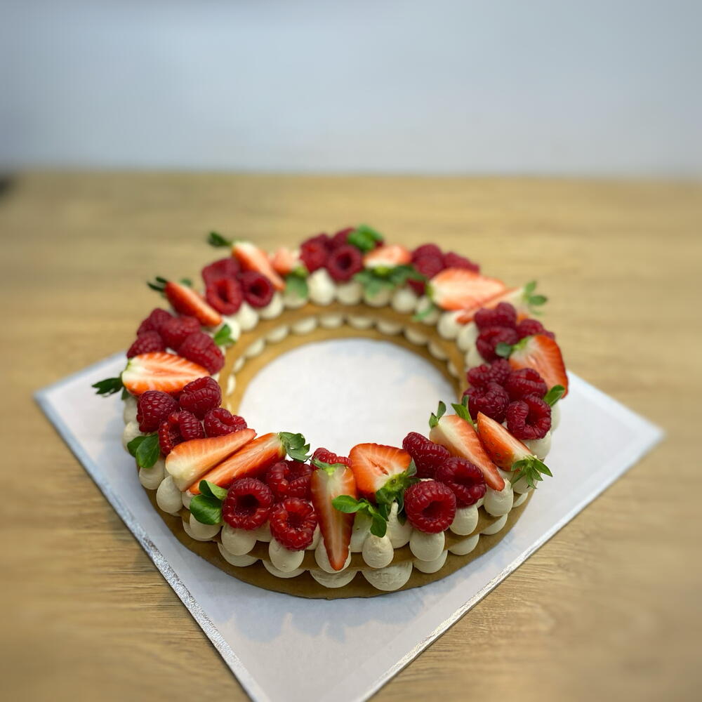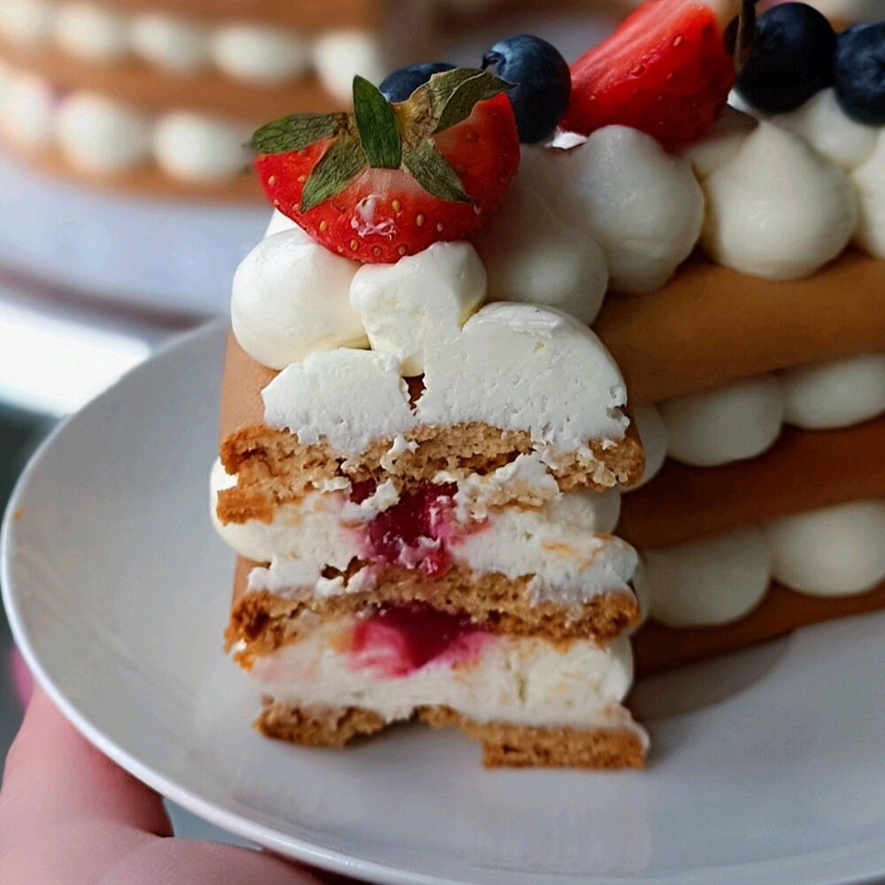 Tarta tipo medovik abierta con finas y suaves capas de masa de miel, intercaladas con una crema suave y cremosa. La tarta se decora con frutos rojos frescos, que aportan frescura y un equilibrio perfecto entre dulzor y acidez. Los delicados capas de masa de miel hacen que la textura sea muy tierna, jugosa y aromática, con un ligero sabor a miel. Presentación elegante en forma redonda.