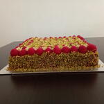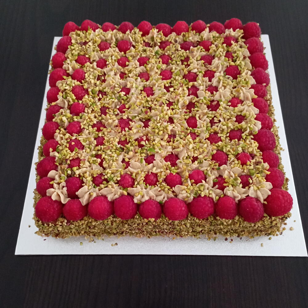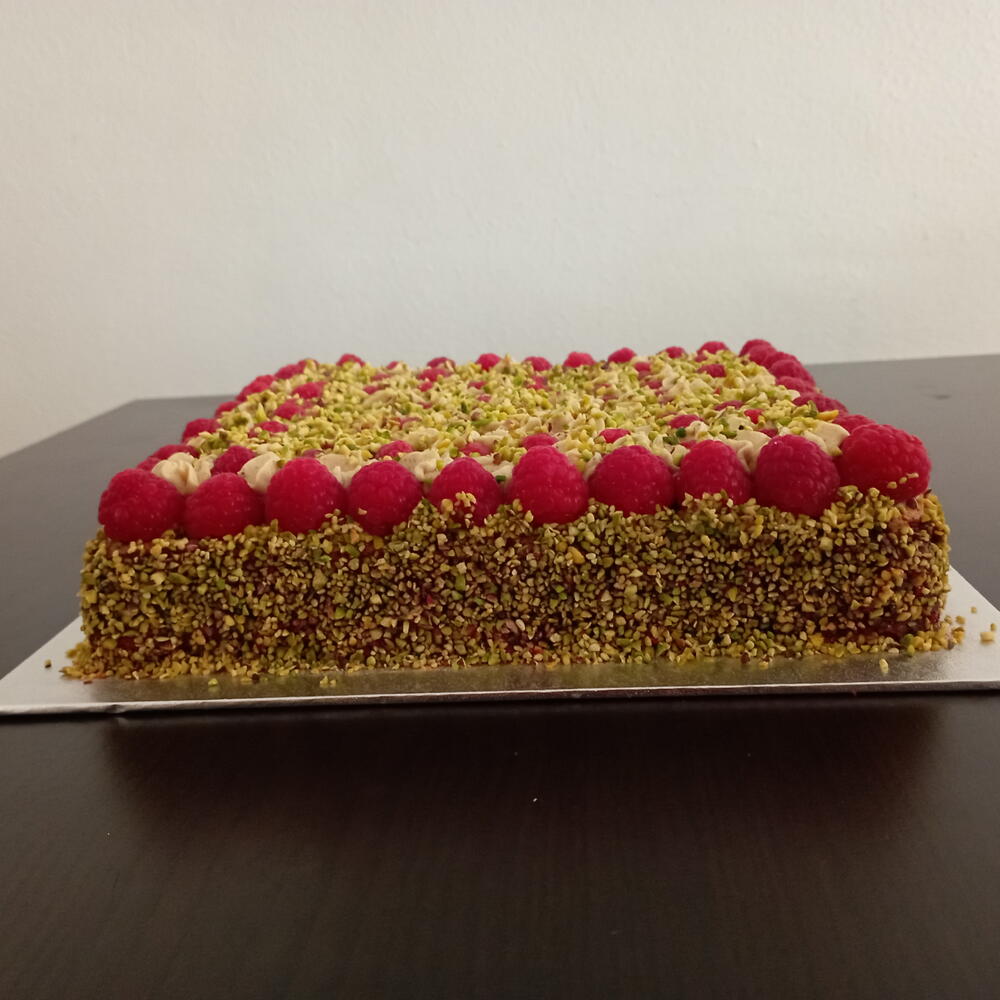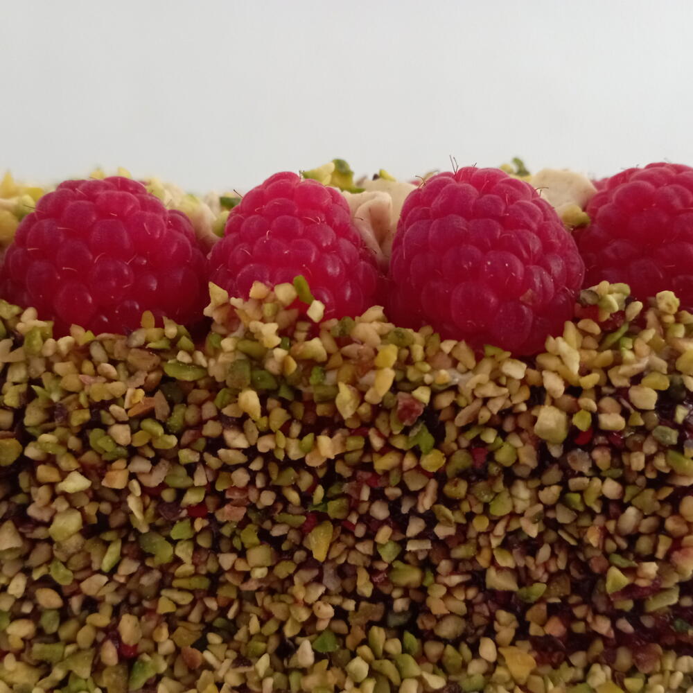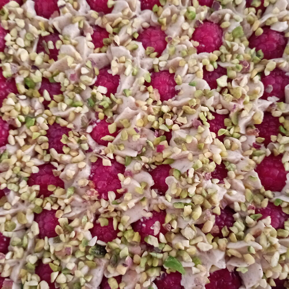 Tarta de tres capas llena de sabor. Un bizcocho Linzer crujiente es la base de este pastel,la segunda capa es un bizcocho muy esponjoso de pistacho y para terminar frambuesas y ganache de chocolate blanco. Una explosión de sabor en cada bocado! La dulzura de la ganache de chocolate está realzada con la acidez de las frambuesas. Una base crujiente,un bizcocho tierno de pistachos y un acabado de ganache y de frambuesas. Prueba ya esta tarta!