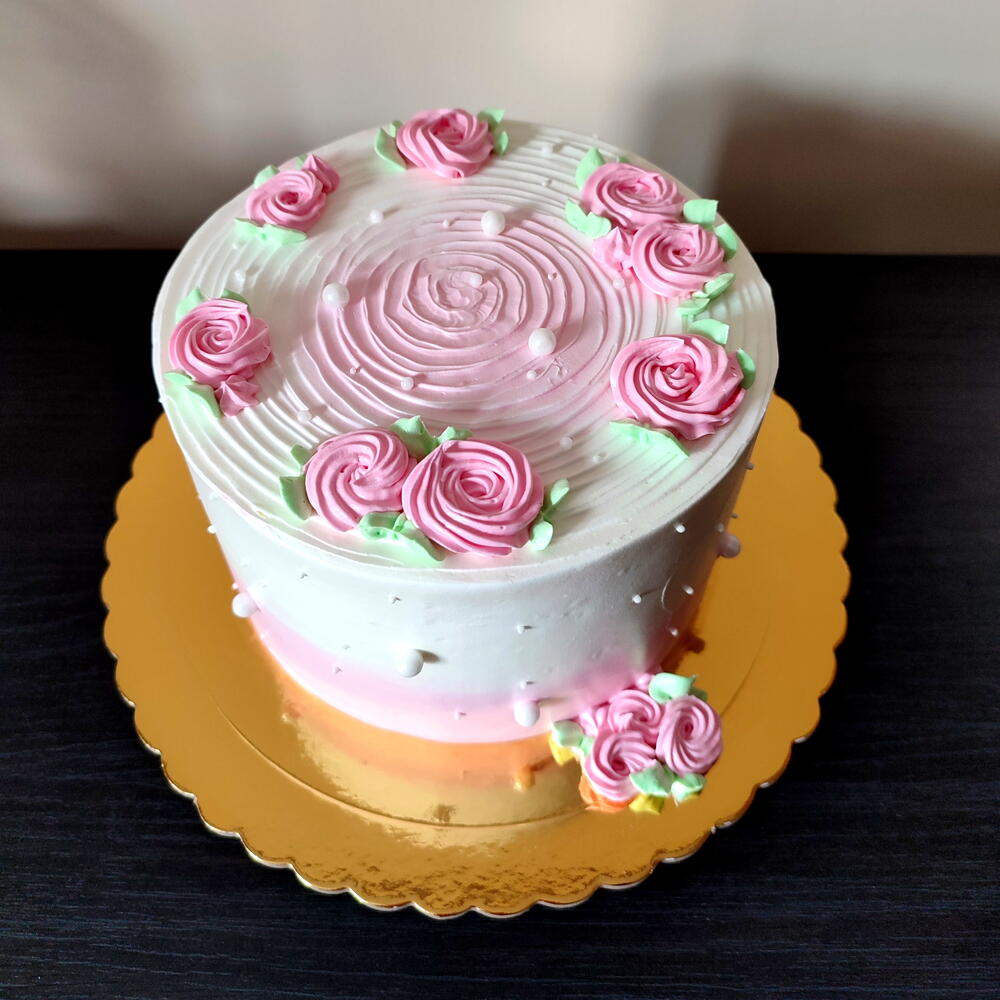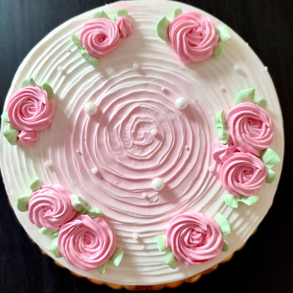 Tarta con cobertura en chantilly y decorada con pequeñas rosas y hojitas verdes . Hechas con boquillas pasteleras. El sabor , bizcocho de yogur , vainilla o chocolate .