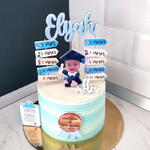 Tarta estilo mesversario decorada en tonos azul pastel y blanco, con efecto degradado y un topper personalizado con el nombre del bebé. Incluye figuras impresas que muestran cada mes de crecimiento, así como un topper central del bebé con birrete de graduación, celebrando el hito de los 11 meses. Ideal para mesversarios, sesiones de fotos, celebraciones infantiles y eventos donde se quiere destacar el desarrollo del bebé de forma tierna y original.