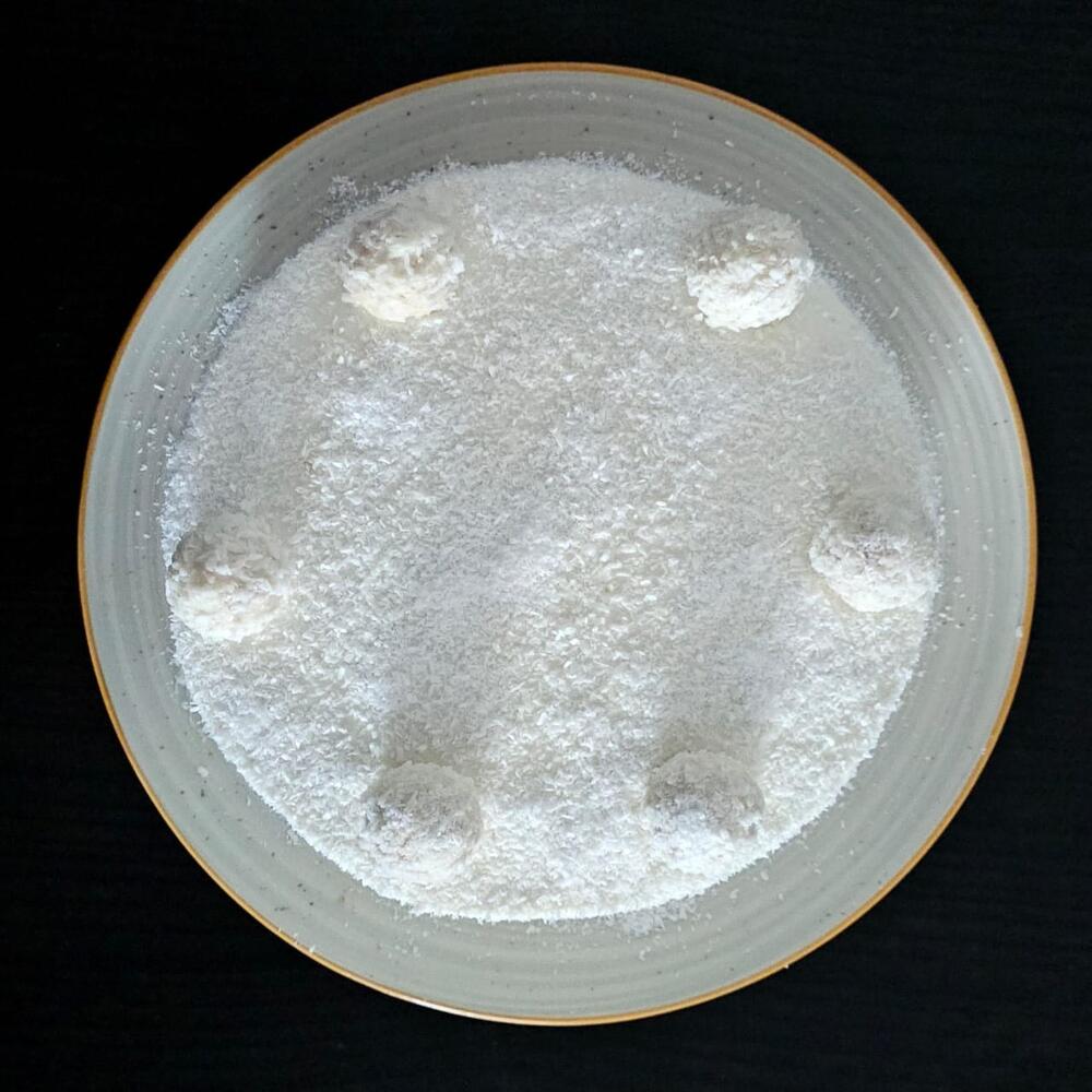 Harina,coco, azúcar, huevos, crema,mascarpone, almendras, bombones Raffaello,leche de coco