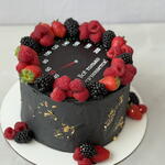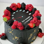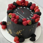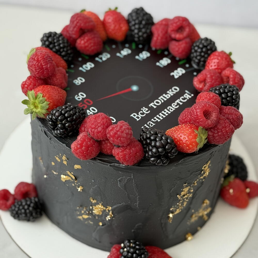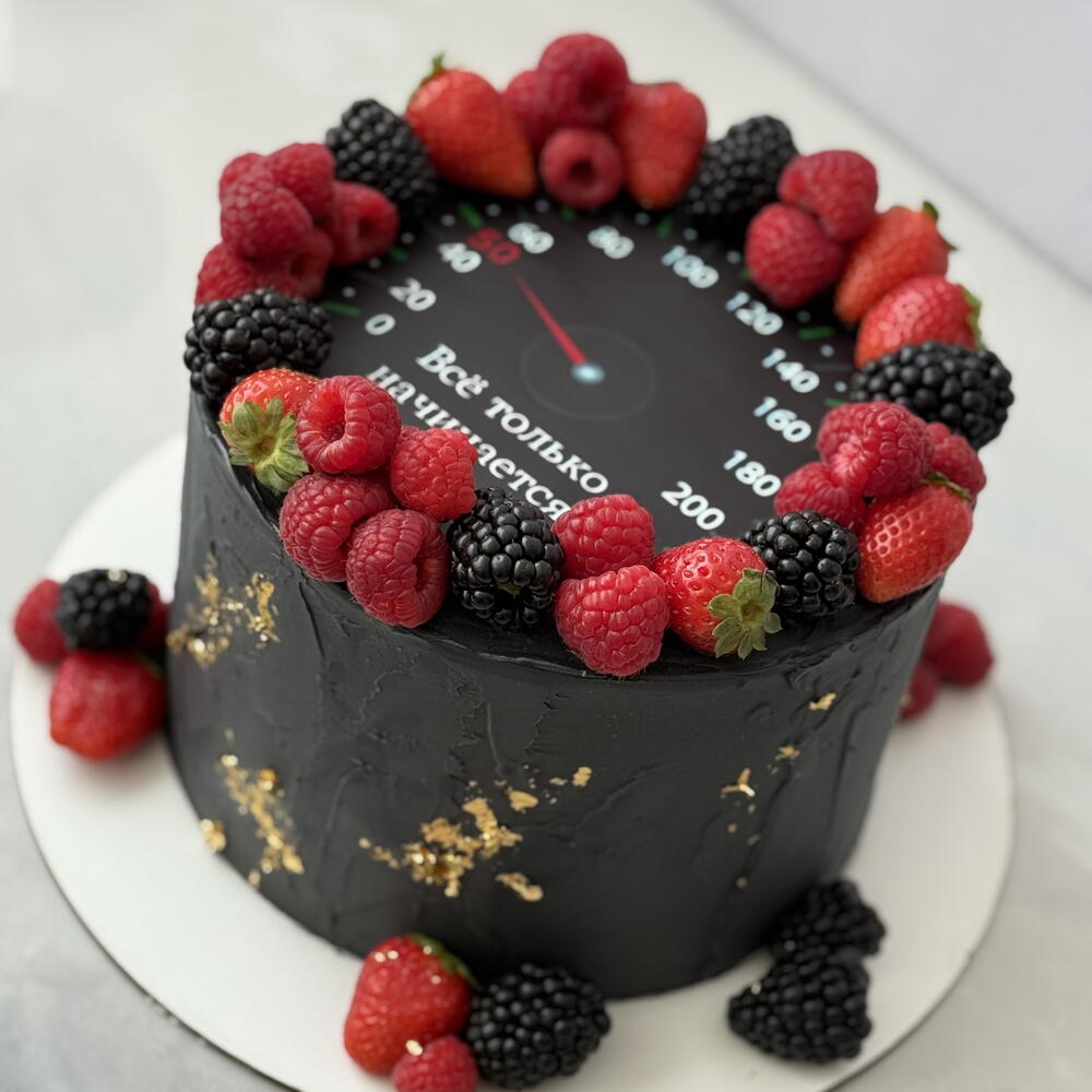 Tarta cilíndrica moderna cubierta con buttercream negro de acabado mate y detalles irregulares en pan de oro. La parte superior imita un velocímetro con números y aguja, creando un diseño gráfico y original. El borde superior está decorado con frambuesas, moras y fresas frescas, que aportan contraste de color y un toque elegante. Un diseño sofisticado y atrevido, ideal para cumpleaños de adultos, celebraciones masculinas o amantes del motor y la velocidad.
