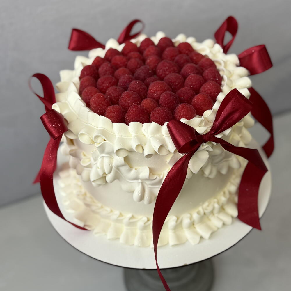 Pastel de terciopelo rojo con crema de fresa y crema de mascarpone En la capa intermedia de confitura de frambuesa