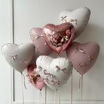 Composición encantadora de globos, donde los corazones rosados y blancos simbolizan amor, calidez y ternura. Esta combinación de tonos suaves crea una atmósfera romántica y festiva, ideal para momentos especiales. 2 corazon rosa mate 2 corazon rosa reflejado 3 corazon blanco