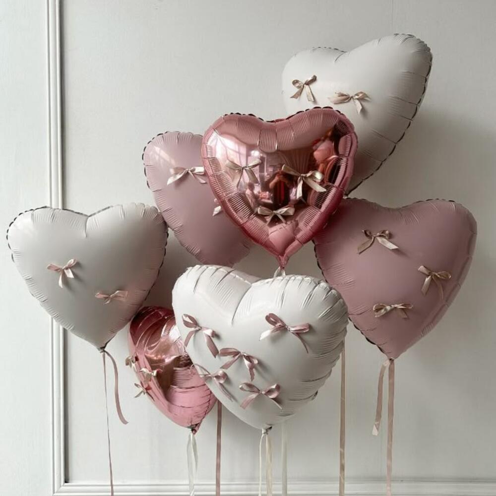 Composición encantadora de globos, donde los corazones rosados y blancos simbolizan amor, calidez y ternura. Esta combinación de tonos suaves crea una atmósfera romántica y festiva, ideal para momentos especiales. 2 corazon rosa mate 2 corazon rosa reflejado 3 corazon blanco