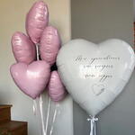 Un elegante corazón blanco acompañado de globos rosa pastel. Ideal para sorpresas románticas y celebraciones delicadas. 1 - corazon globo XL 6 - corazon globos rosas 45cm