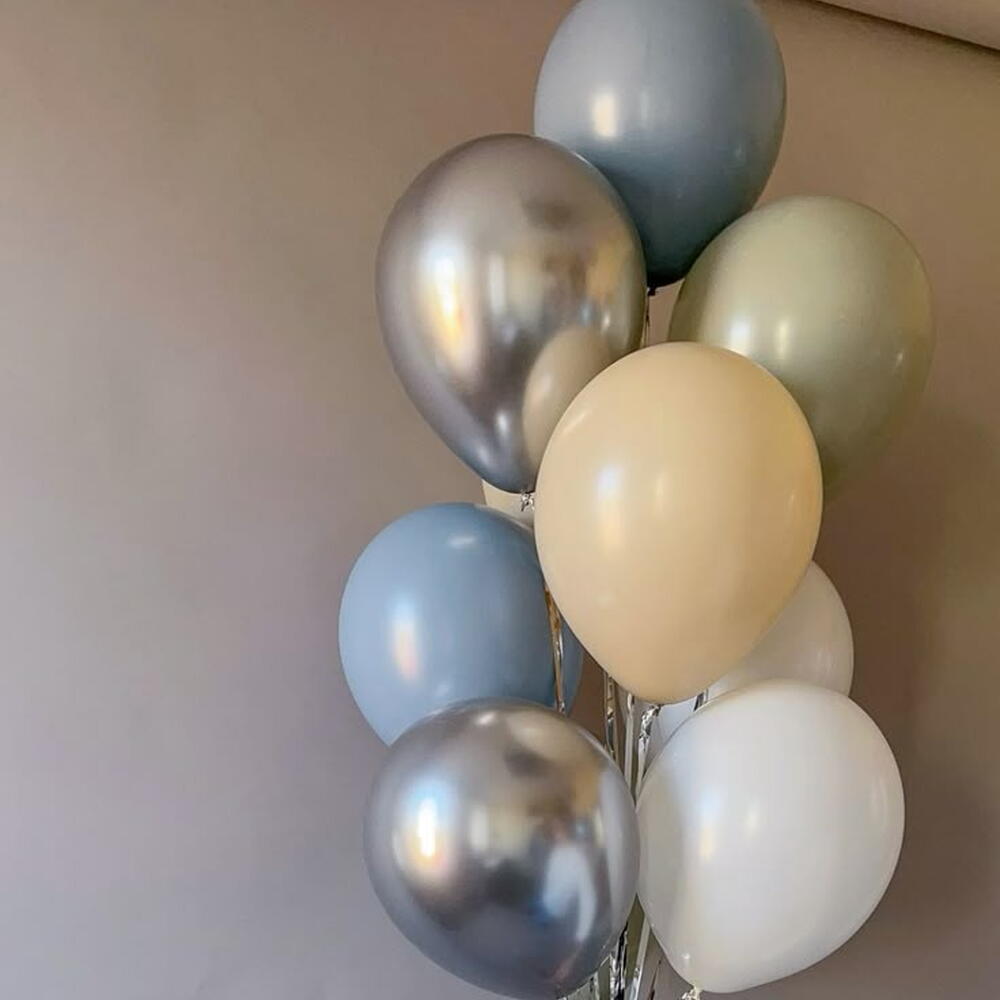 Una combinación etérea de azul, plata, durazno y blanco. ¡Perfectos para un ambiente suave y soñador! 2 - blanco globos 1 - olive globos 2 - plata globos 2 - azul globos 2 - beige globos