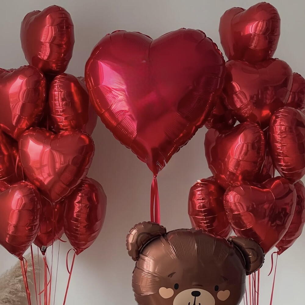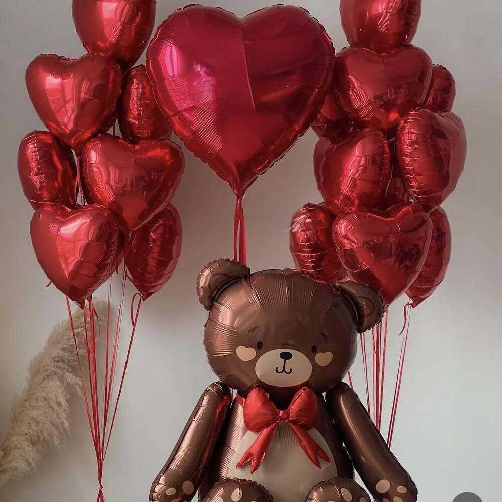 Conjunto de globos para cumpleaños, para el día de San Valentín - 1 globo en forma de oso, 75*84cm - 1 globo en forma de corazón, 81cm - 20 globos en forma de corazón, 45cm Se puede escribir un nombre en el corazón grande. Por favor, incluya el nombre en los comentarios del pedido.
