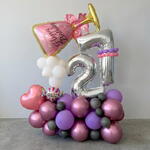 Globo metálico número 2 - 1 unidad Globo metálico número 1 - 1 unidad Globo metálico copa Happy Birthday - 1 unidad Globo metálico corazón rosado - 1 unidad Globo metálico redondo con mensaje - 1 unidad Globos látex metálicos (rosado, morado, negro) - 15 unidades Globos látex blancos - 6 unidades Decoración adicional en mini-globos - 5 unidades
