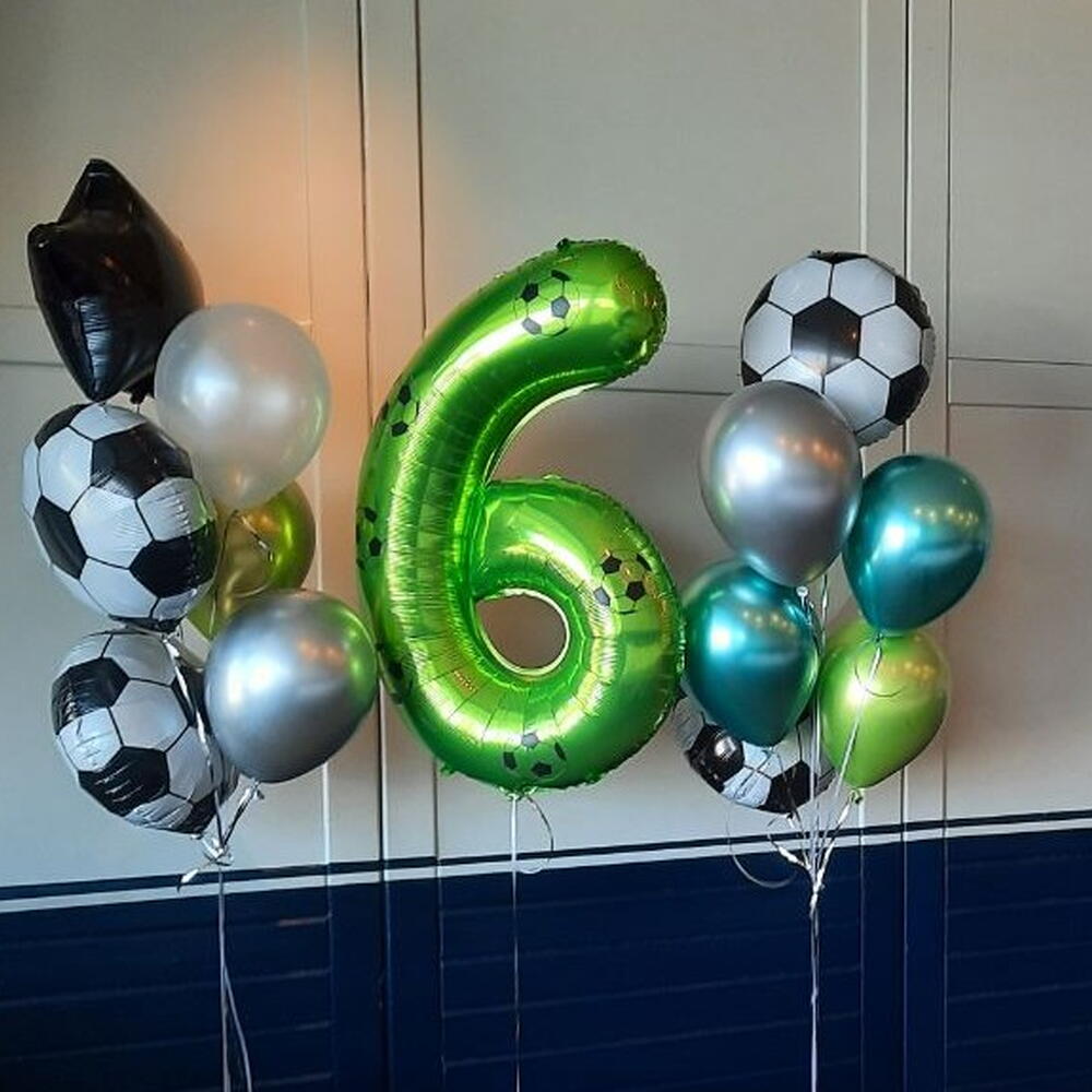 La decoración perfecta para los amantes del fútbol! Clásicos blanco y negro del balón combinados con colores vibrantes del equipo para una fiesta llena de pasión futbolera. 1 - numero globo 1 - estrella negra globo 4 - balon de futbol 4 - verde globo 2 - plata globo 2 - transparente globo