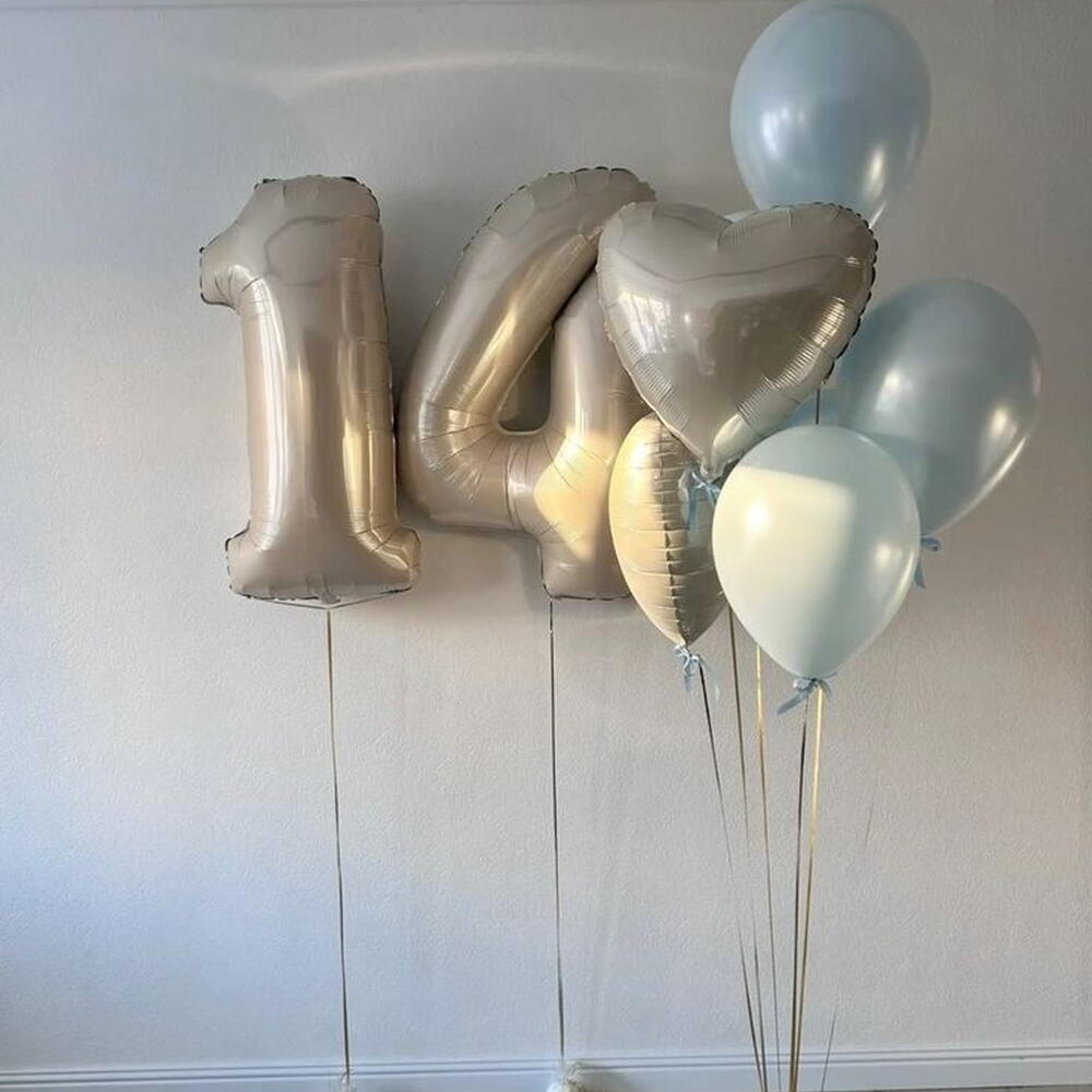 Tonos azul suave que crean un ambiente tierno y mágico. ¡Perfecto para un cumpleaños encantador! 2 - beige numero 110 cm 2 - beige corazón 5 - azul globos
