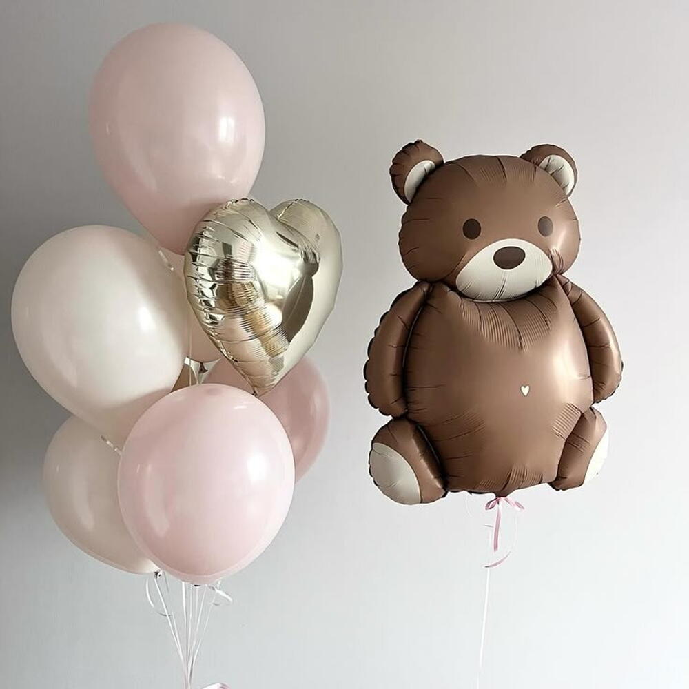Tonos suaves y un osito adorable crean un ambiente cálido, tierno y acogedor. ¡Perfecto para momentos especiales! 4 - rosa globos 3 - blanco globos 1 - plata corazon 1 - oso 90 cm