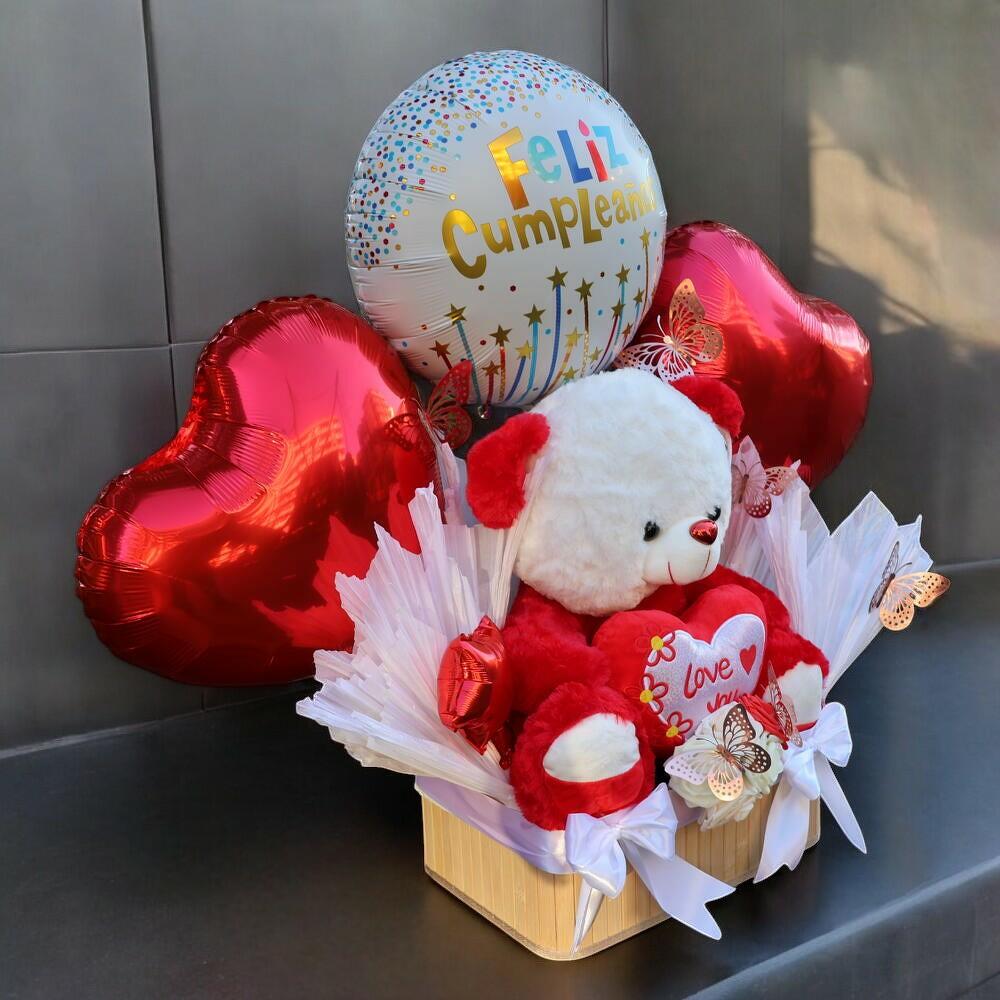 Oso Happy Birthday en Canasta con Globos y Decoracion Especial