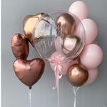 Elegante ramo de globos lleva un globo burbuja, 3 corazones metálicos y 12 globos de látex. Todos inflados con gas helio y atados con su peso para una colocación armoniosa.