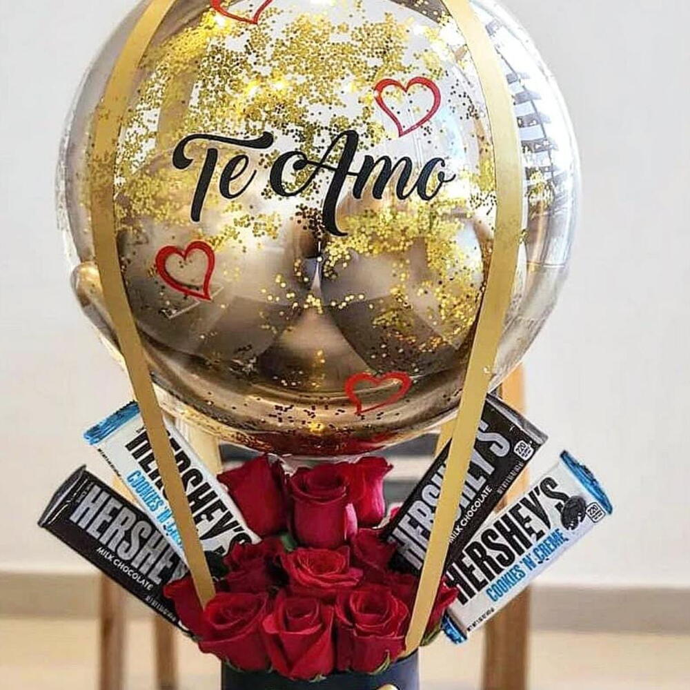 Este encantador arreglo es perfecto para expresar amor de una manera elegante y sorprendente. El globo transparente con destellos dorados y la frase **“Te Amo”** aporta un toque mágico y especial. Las rosas rojas, vibrantes y llenas de sentimiento, crean un hermoso contraste con los detalles dorados del diseño. Las barras de chocolate Hershey’s añaden un toque dulce que completa el regalo ideal. La base negra con moño dorado brinda un acabado moderno y sofisticado. Cada elemento está cuidadosamente acomodado para lograr una presentación armoniosa y llamativa. ¡Un detalle inolvidable para celebrar momentos llenos de cariño!