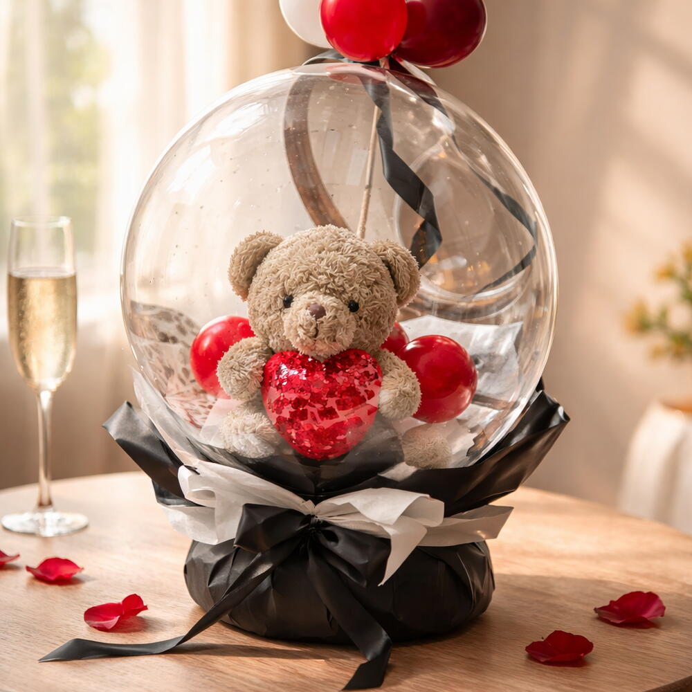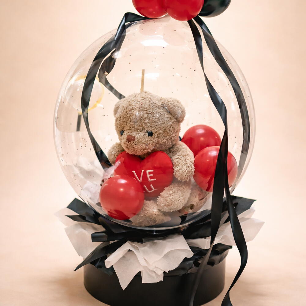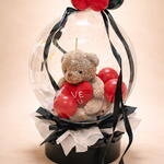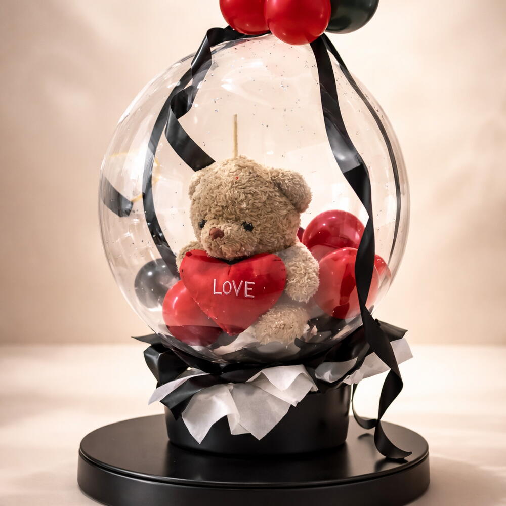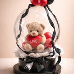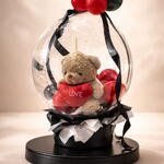 Oso Teddy de treinta centímetros, encapsulado en un globo cristal gigante acompañado de globos rojos negros y blancos especial para esa personita que amas.