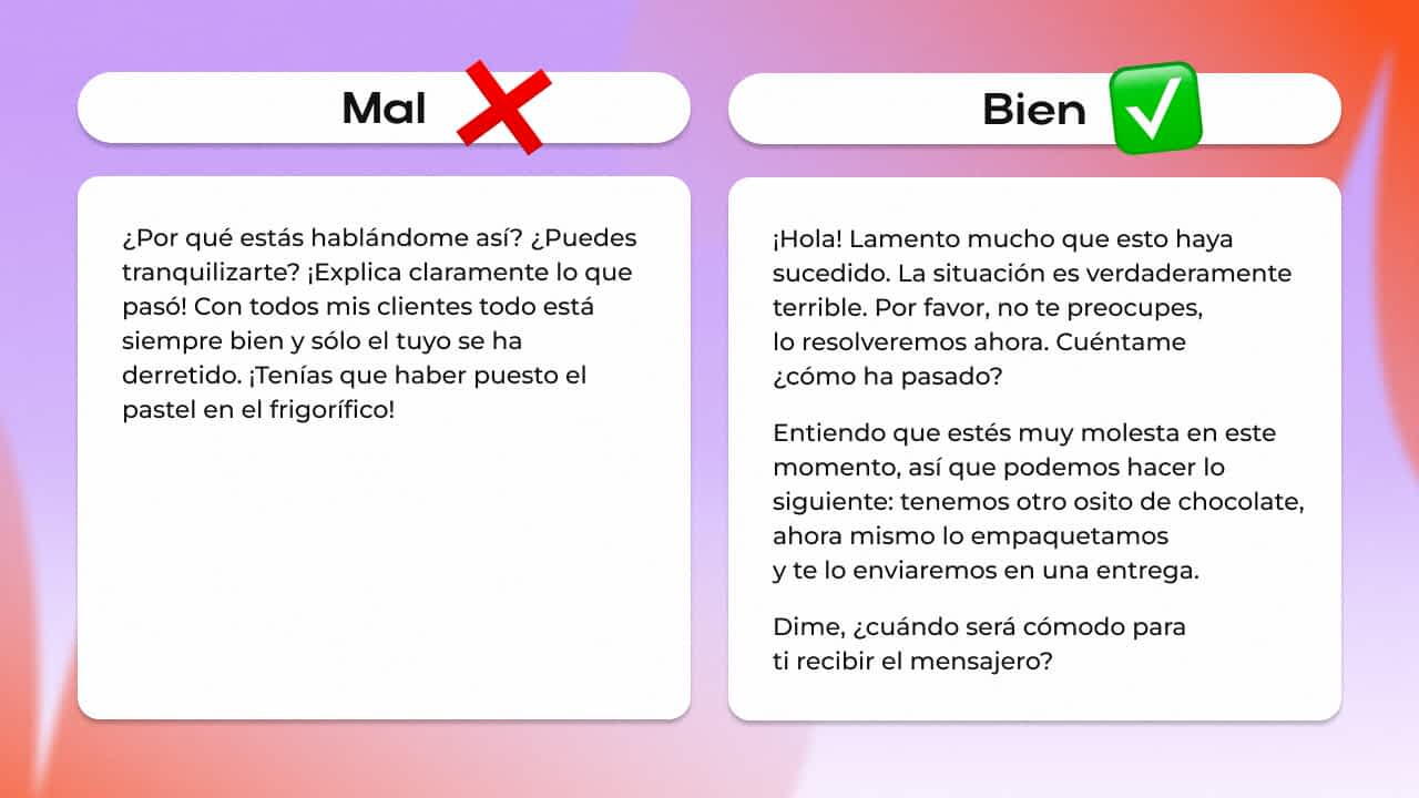 En una buena respuesta, vemos que el vendedor se compadece del cliente, comparte sus emociones y no las silencia. Luego demuestra un deseo sincero de descubrir qué sucedió y, al final, ofrece una solución al problema aquí y ahora.