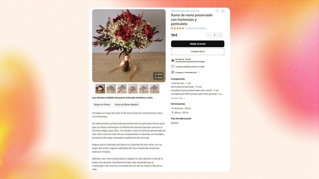 Todo lo que se añade a una ficha de producto (descripción, foto y vídeo) influye en los resultados de la búsqueda. Cuanto mejor rellenadas estén las fichas, mayor será la probabilidad de que el cliente elija su producto. No olvides rellenar todos los datos para que el producto pueda encontrarse a través de filtros y categorías.