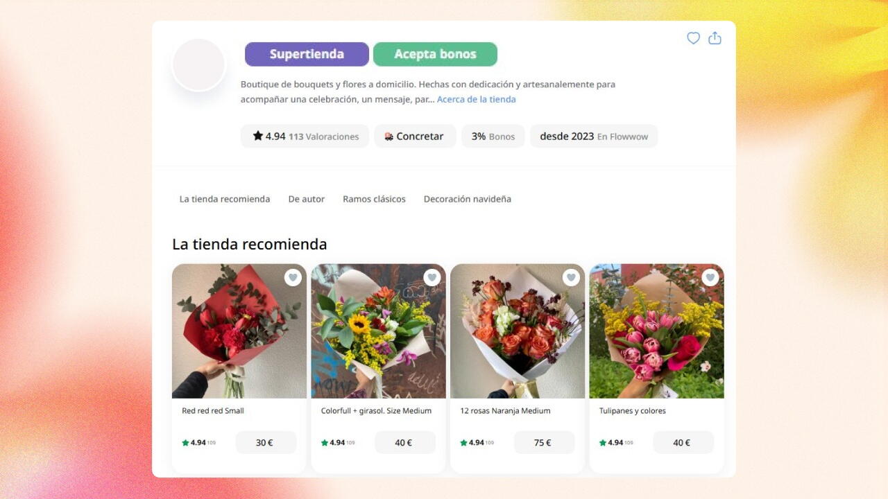 - Enlaces a la tienda en redes sociales: Comparte enlaces a Flowwow en tus redes sociales y otras plataformas – es la forma más fácil de llegar a más gente. Un buen beneficio adicional – para los pedidos realizados por los clientes que utilizan un enlace directo a la tienda en Flowwow, la comisión fija será del 0%. Más detalles en otro artículo.