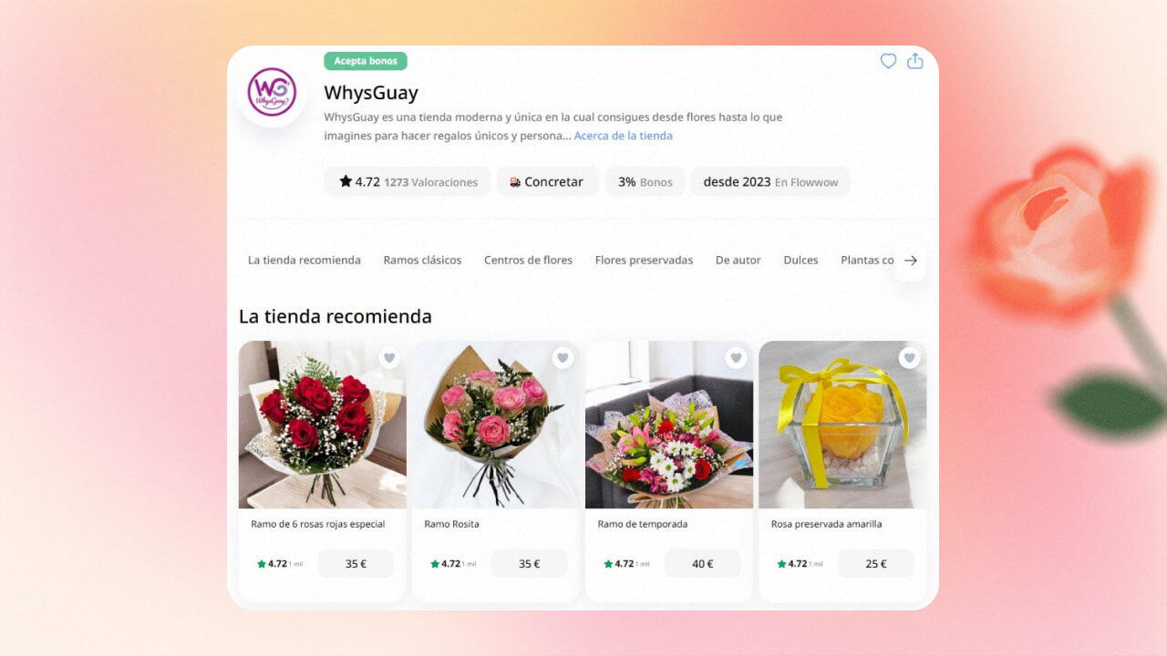 WhysGuay fue una de las primeras floristerías en Madrid en unirse a Flowwow, viendo en la plataforma una oportunidad de innovación y expansión. Gracias a herramientas como WowPass y la promoción a través de Supershop, sus ventas crecieron considerablemente. Además, el soporte rápido y eficaz ha sido clave para su experiencia positiva en la plataforma.