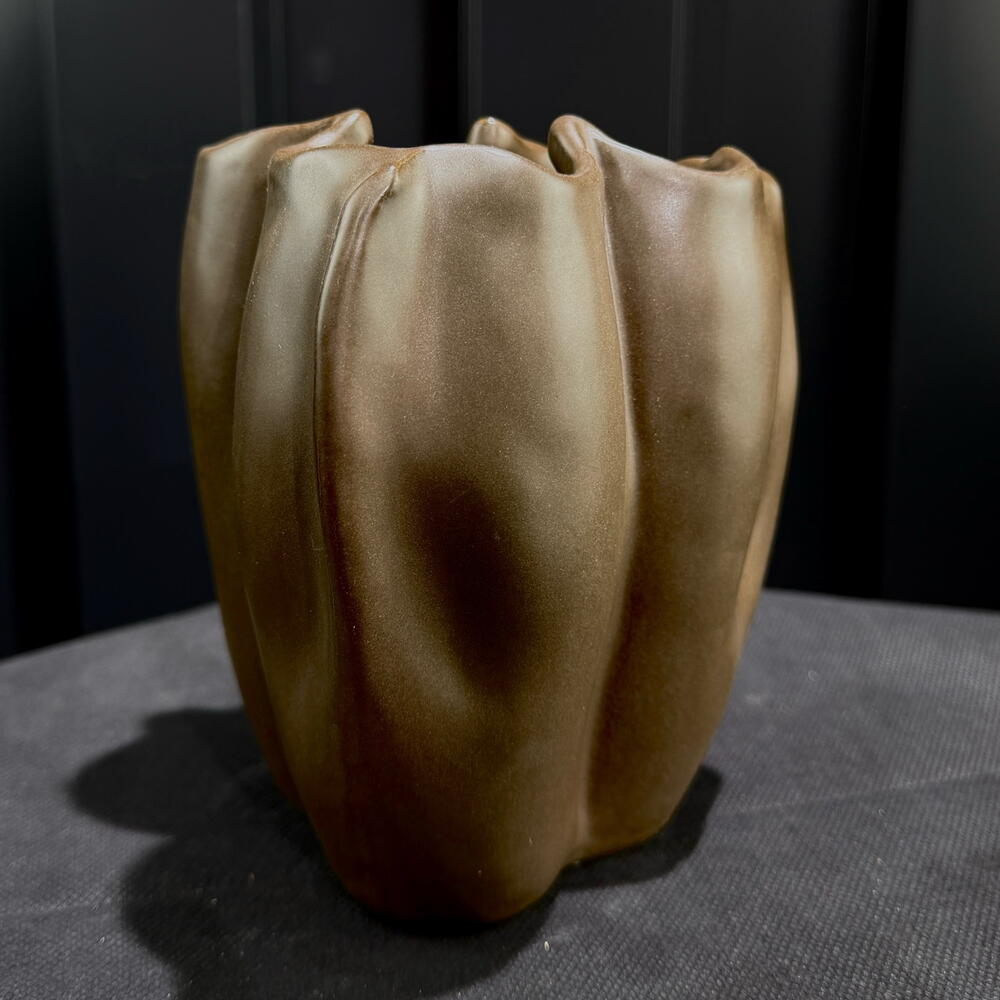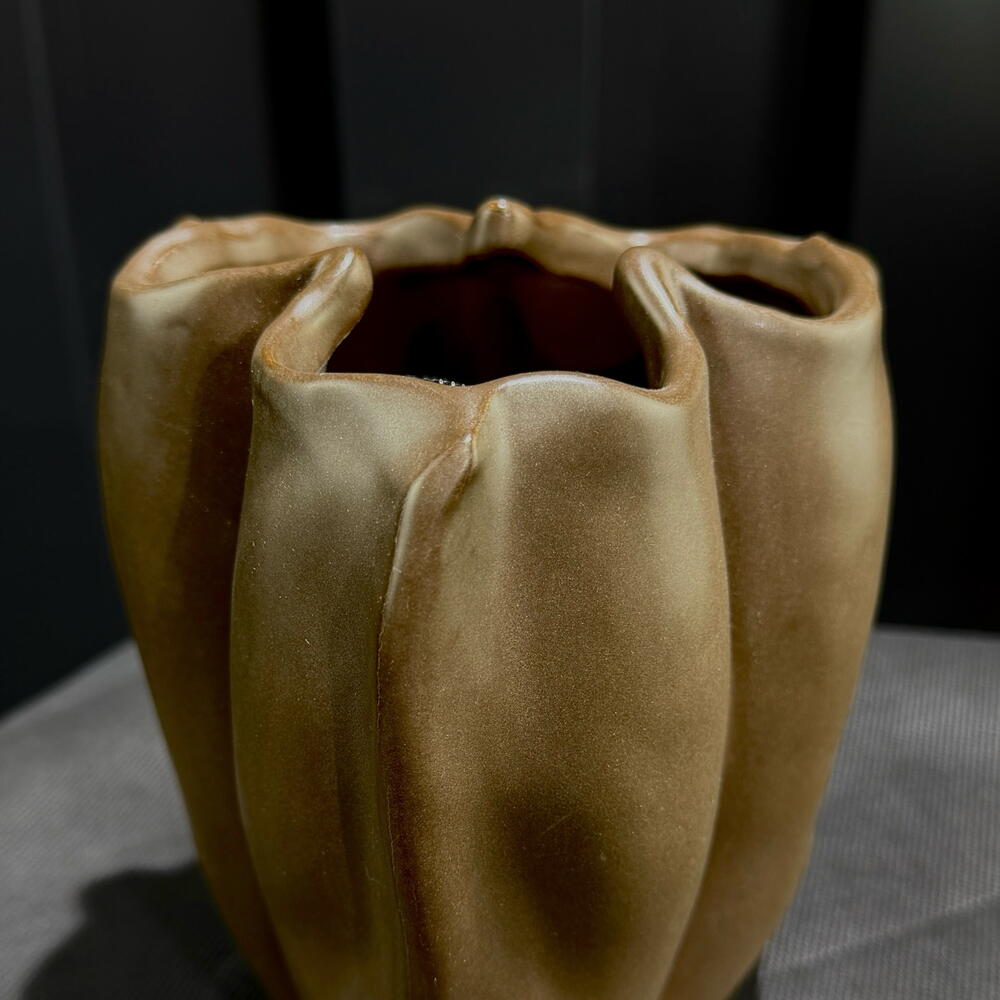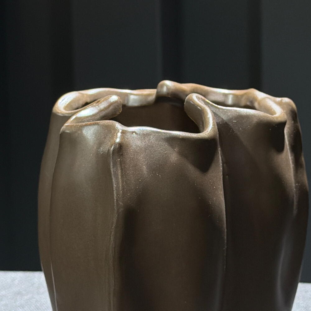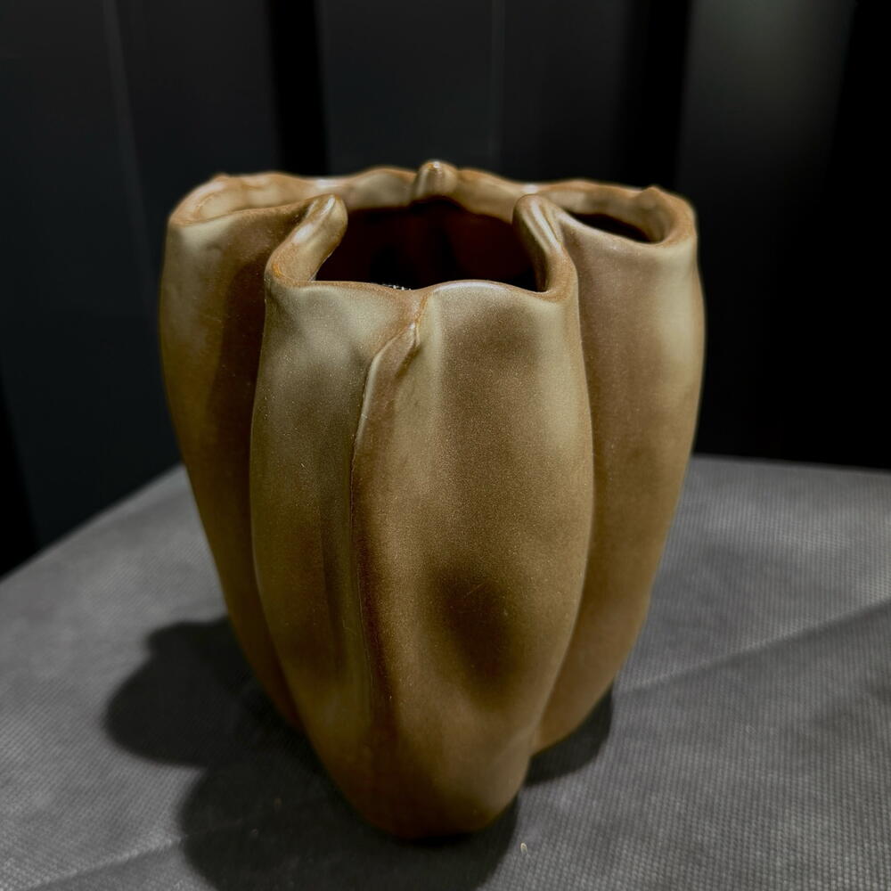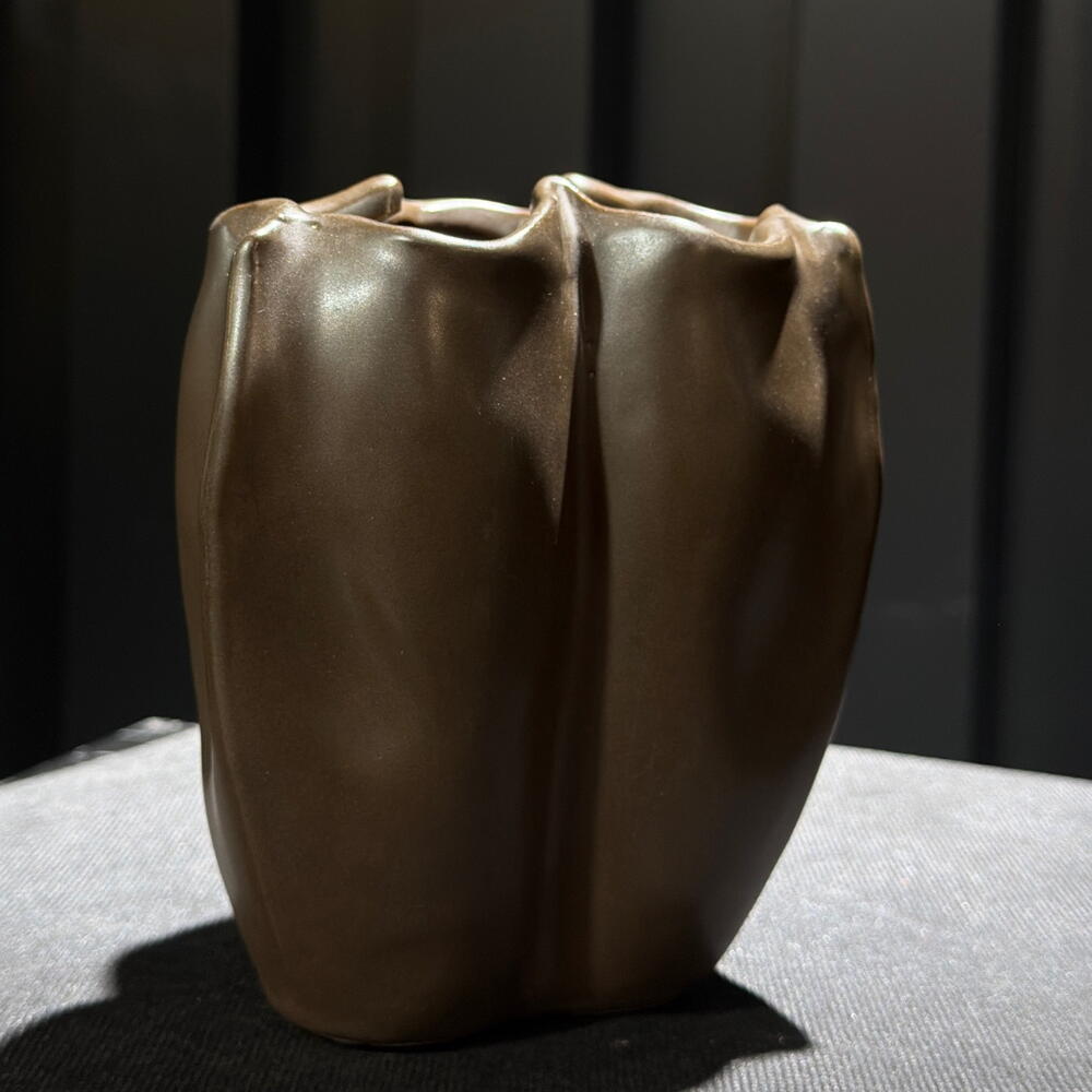 Jarrón de cerámica mate en tonos tierra Diseño orgánico con líneas suaves y textura satinada que aporta calidez y elegancia. Sus formas redondeadas y el acabado marrón degradado la convierten en una pieza versátil para cualquier estilo de interior. Ideal para ramos pequeños, flores individuales o como elemento decorativo. a.447