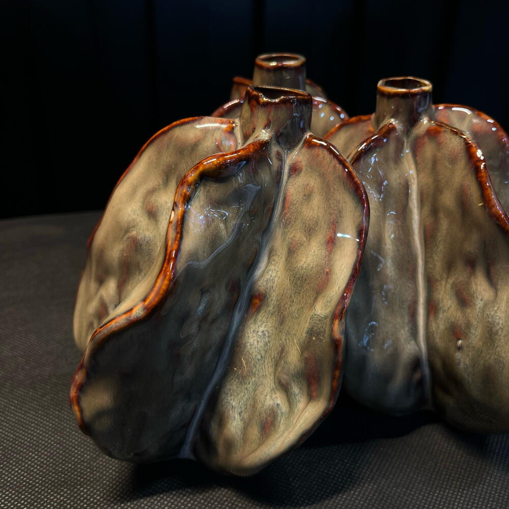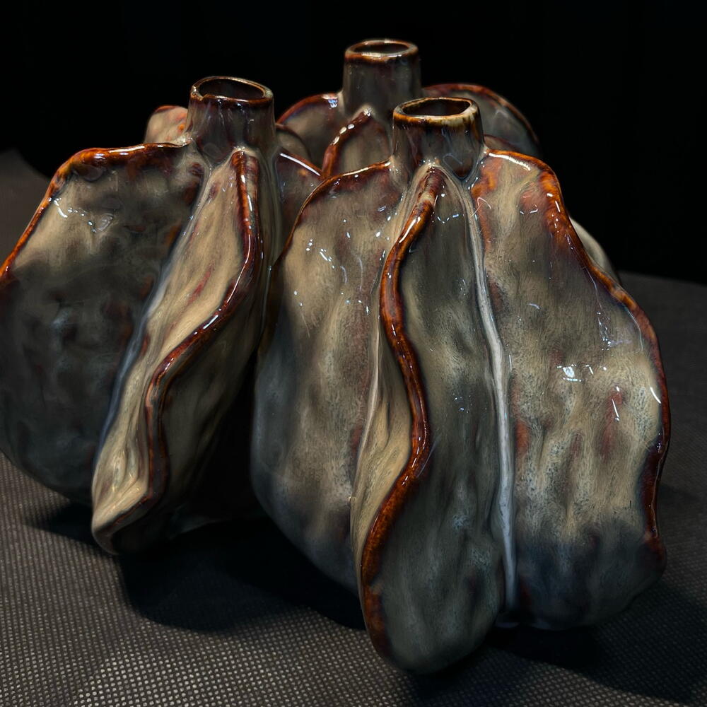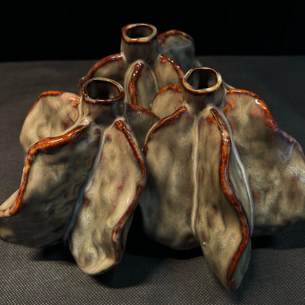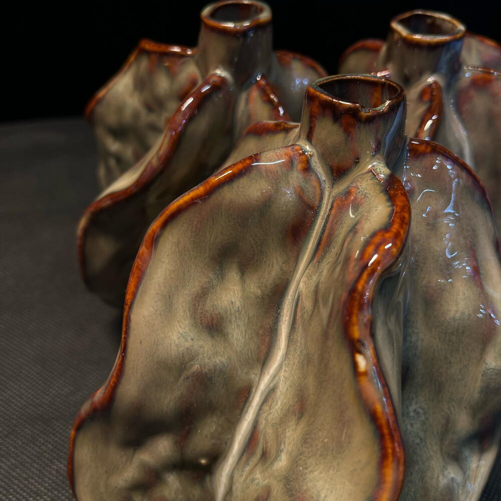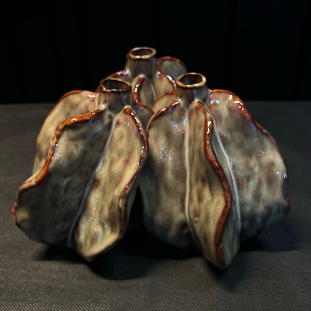 Pieza decorativa de cerámica con forma orgánica inspirada en pétalos abiertos. Su diseño escultórico y sus múltiples aperturas permiten crear composiciones florales originales y modernas. El acabado brillante en tonos grises con detalles rojizos aporta un estilo artístico y contemporáneo, perfecto para decorar espacios de diseño o utilizar como centro floral único.