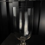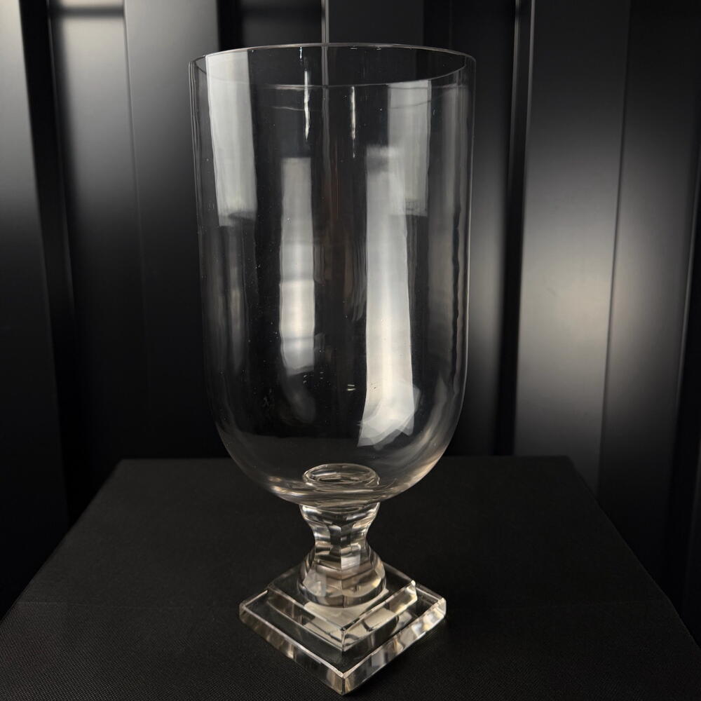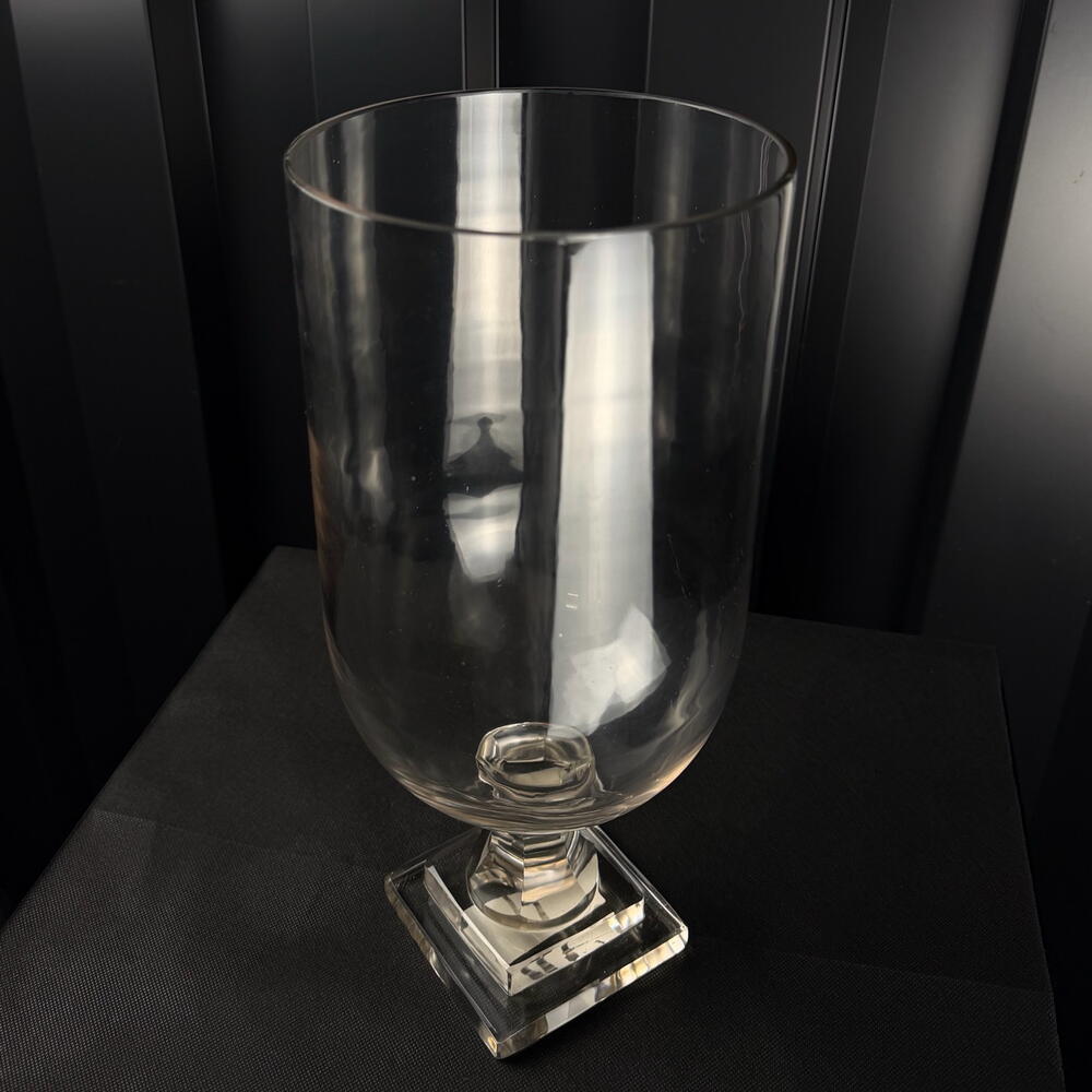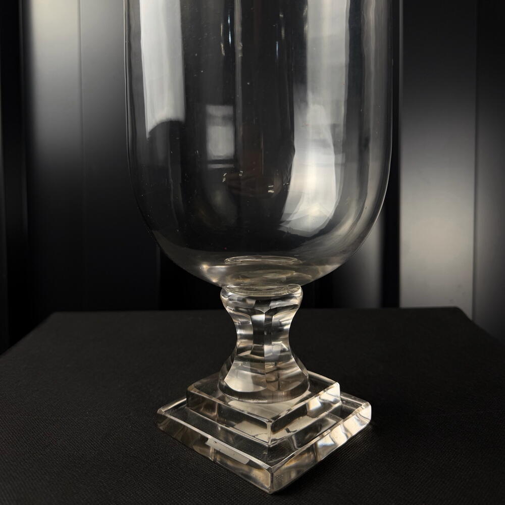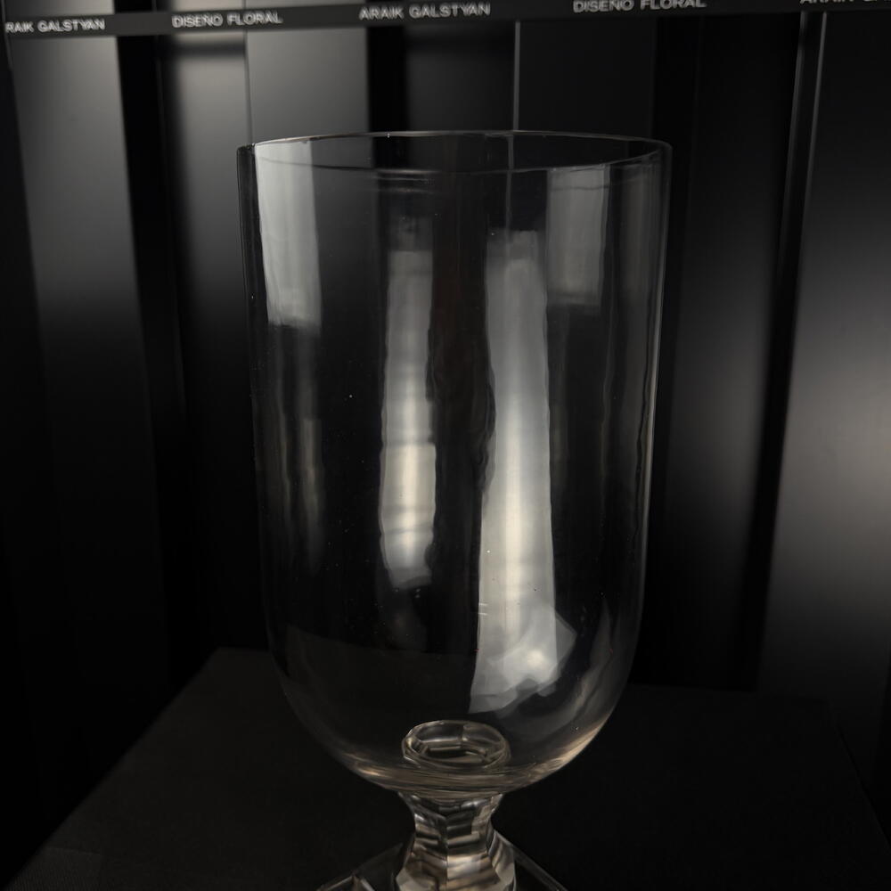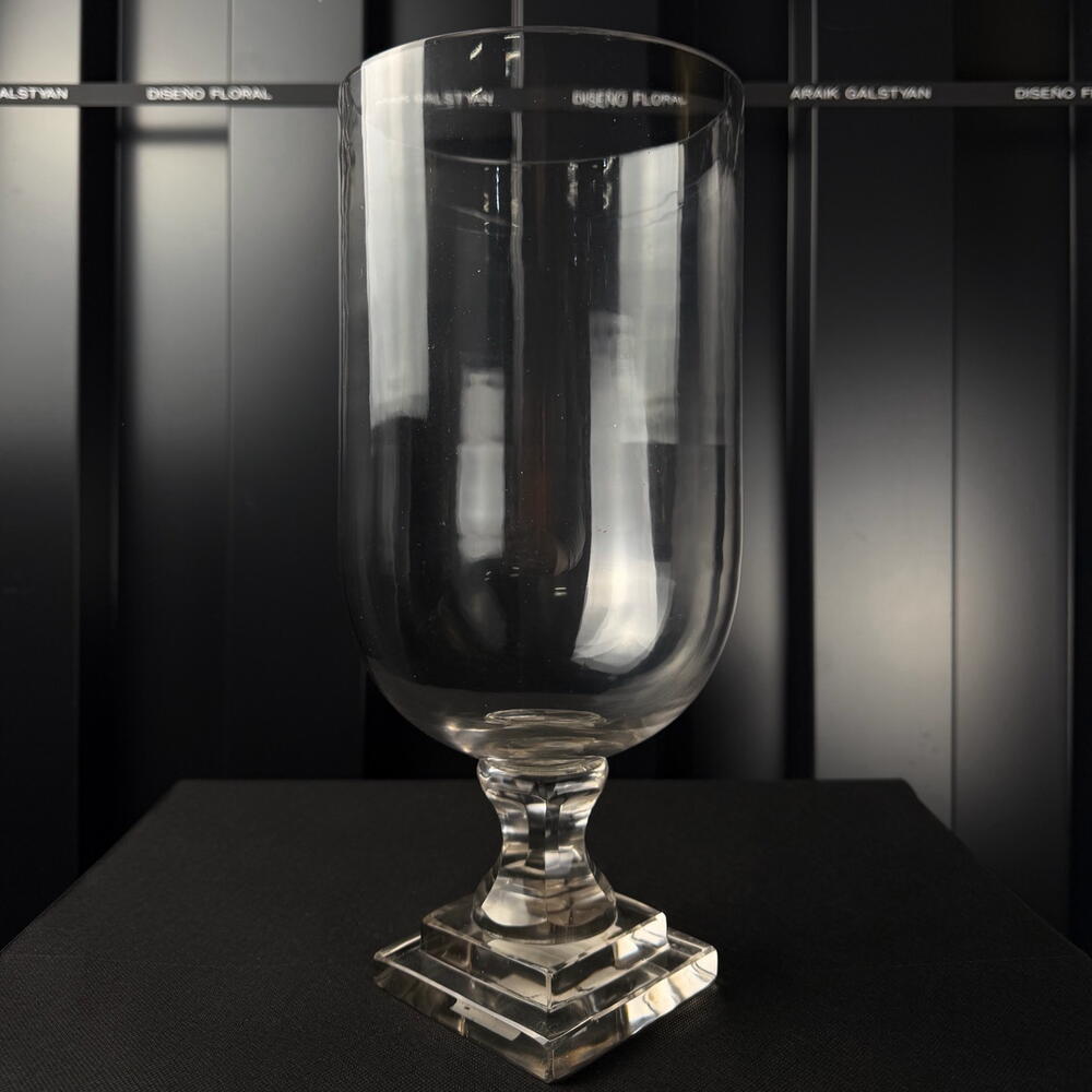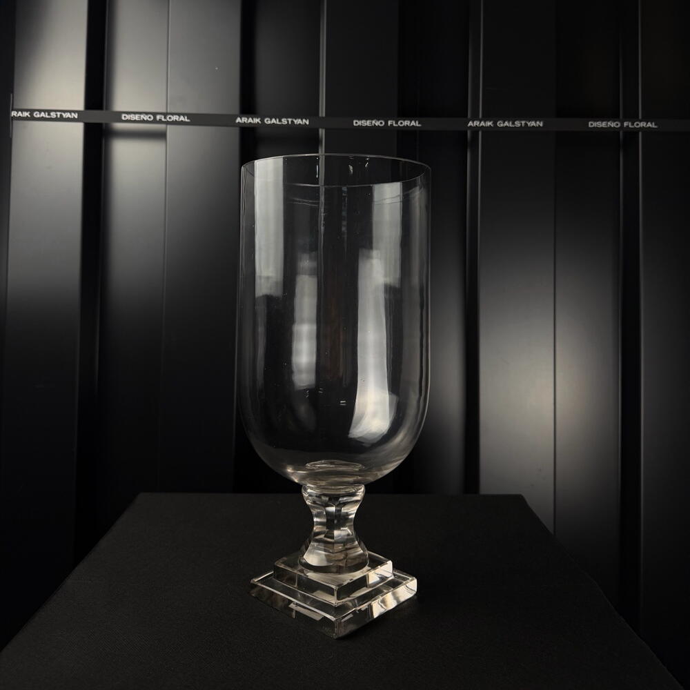 Jarrón de vidrio transparente con base decorativa, diseño elegante y minimalista, ideal para arreglos florales y decoración interior.