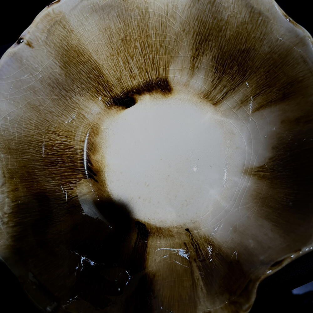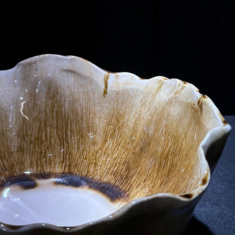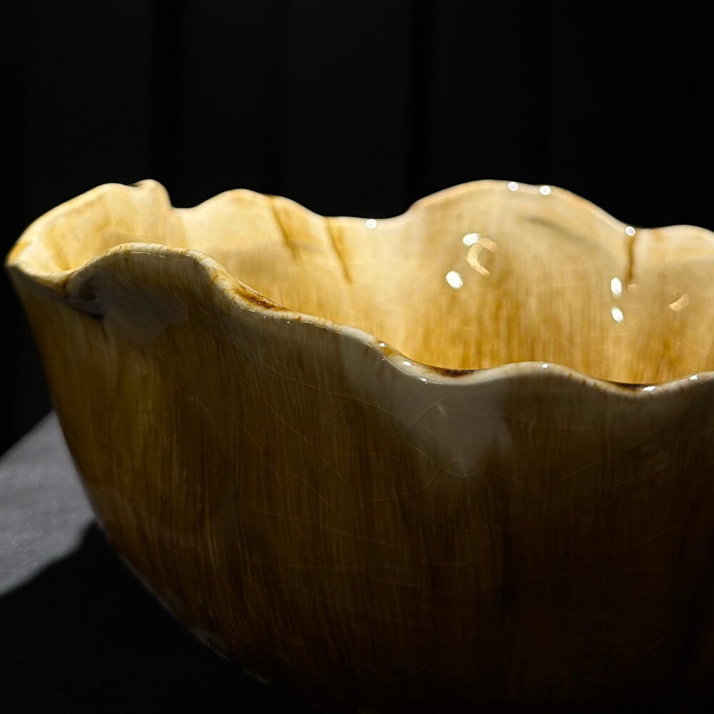 Cuenco de cerámica artesanal en tonos ámbar con borde ondulado. Pieza decorativa elegante, ideal para arreglos florales, centros de mesa o como acento en interiores modernos. a.870