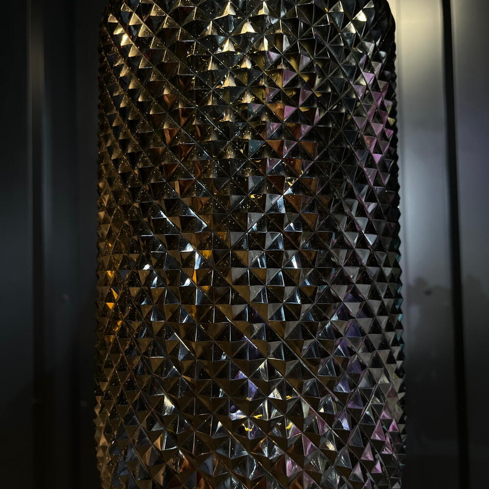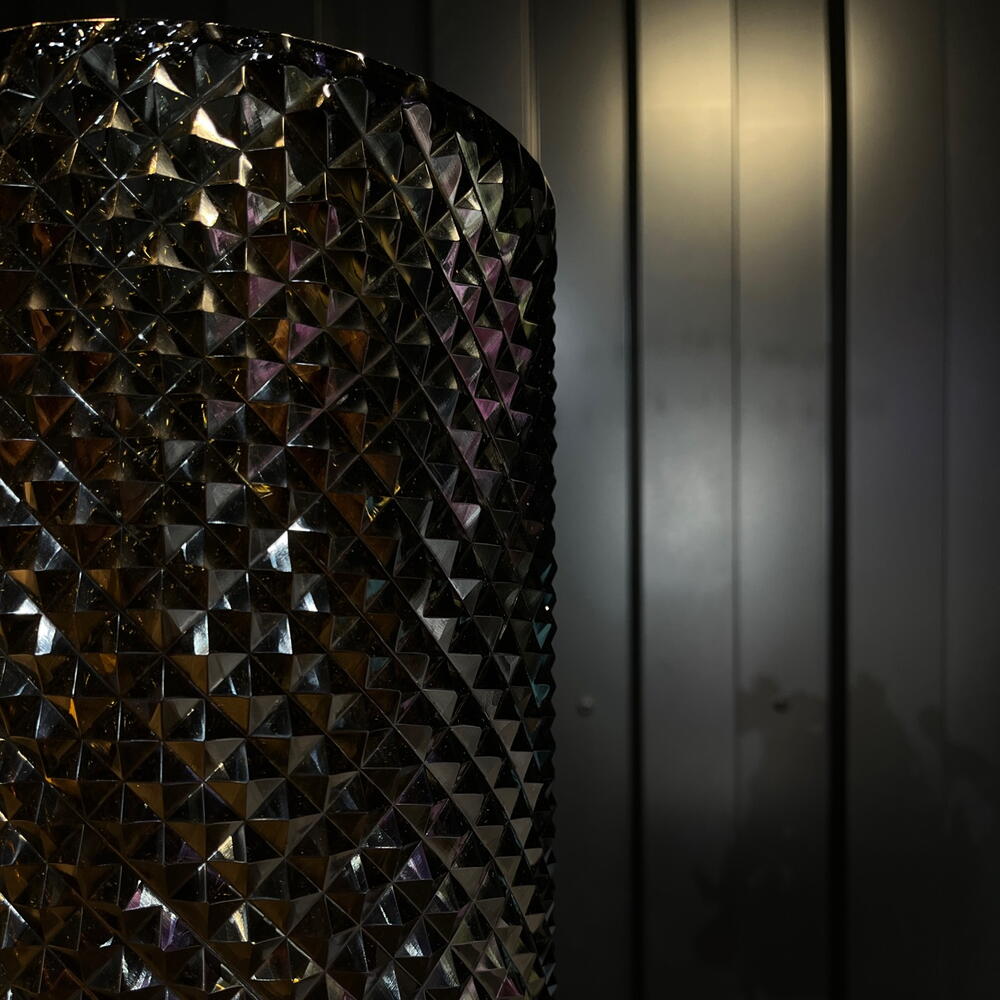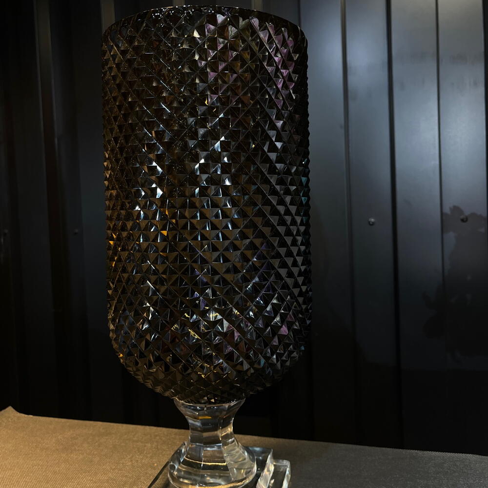 Un jarrón elegante y majestuoso: su cuerpo de vidrio oscuro con corte diamante brilla como una joya, mientras que su base transparente lo eleva con un aire de sofisticación. Una pieza que combina lujo y modernidad en un solo diseño deslumbrante.