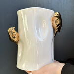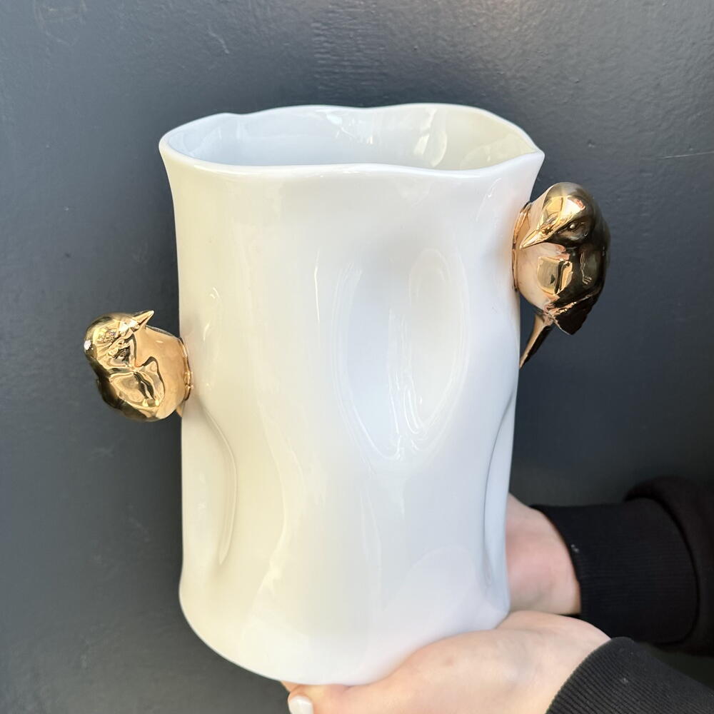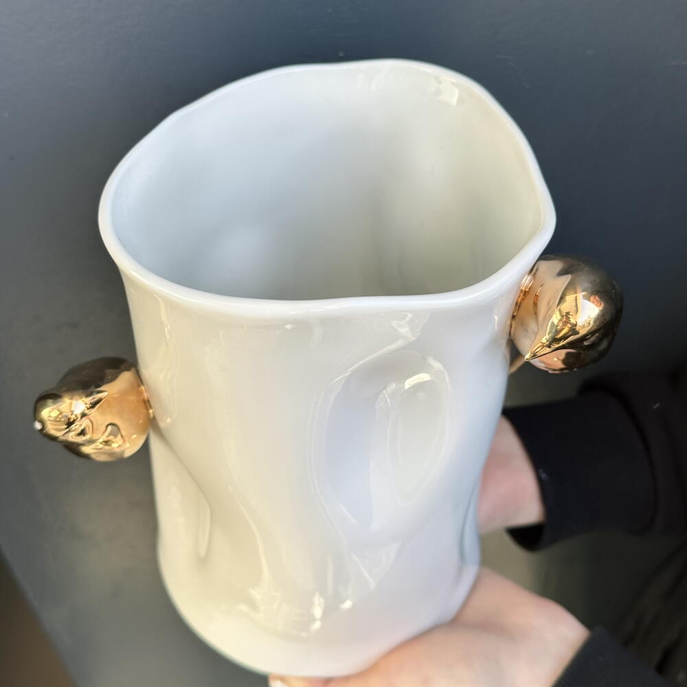 Un hermoso jarrón decorativo de autor, elegante y estilizado, diseñado para complementar cualquier espacio interior. Destaca por su forma armoniosa y su estética sofisticada, aportando un toque de personalidad y arte al ambiente.