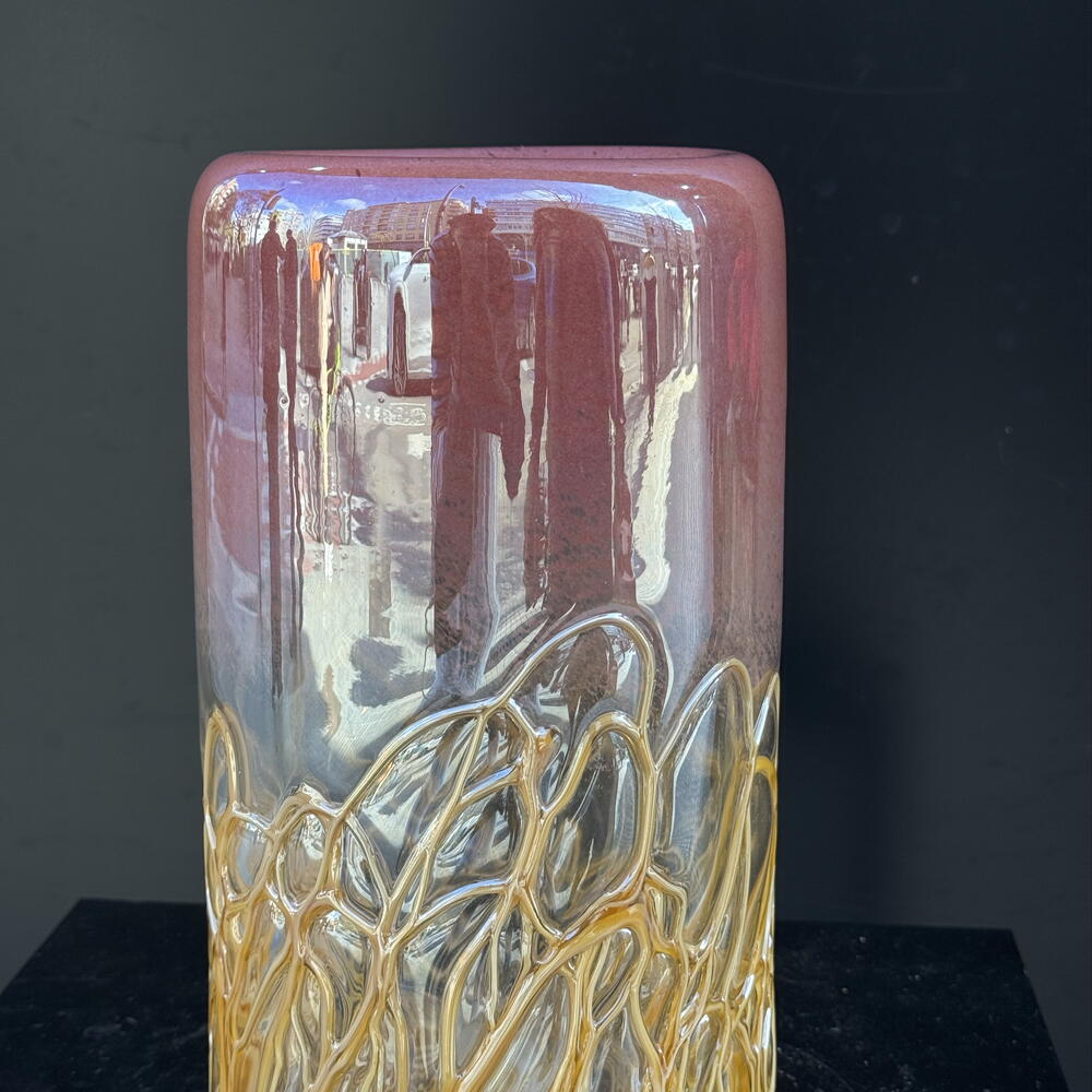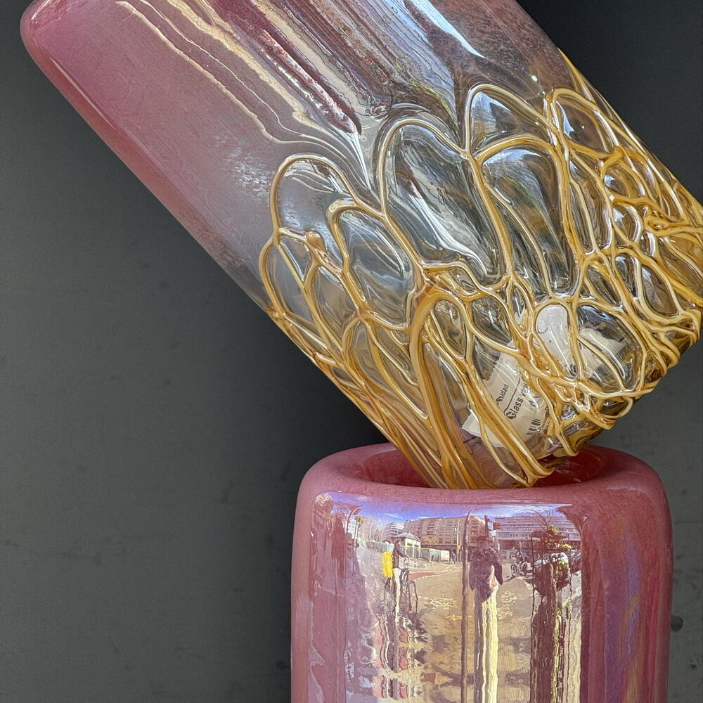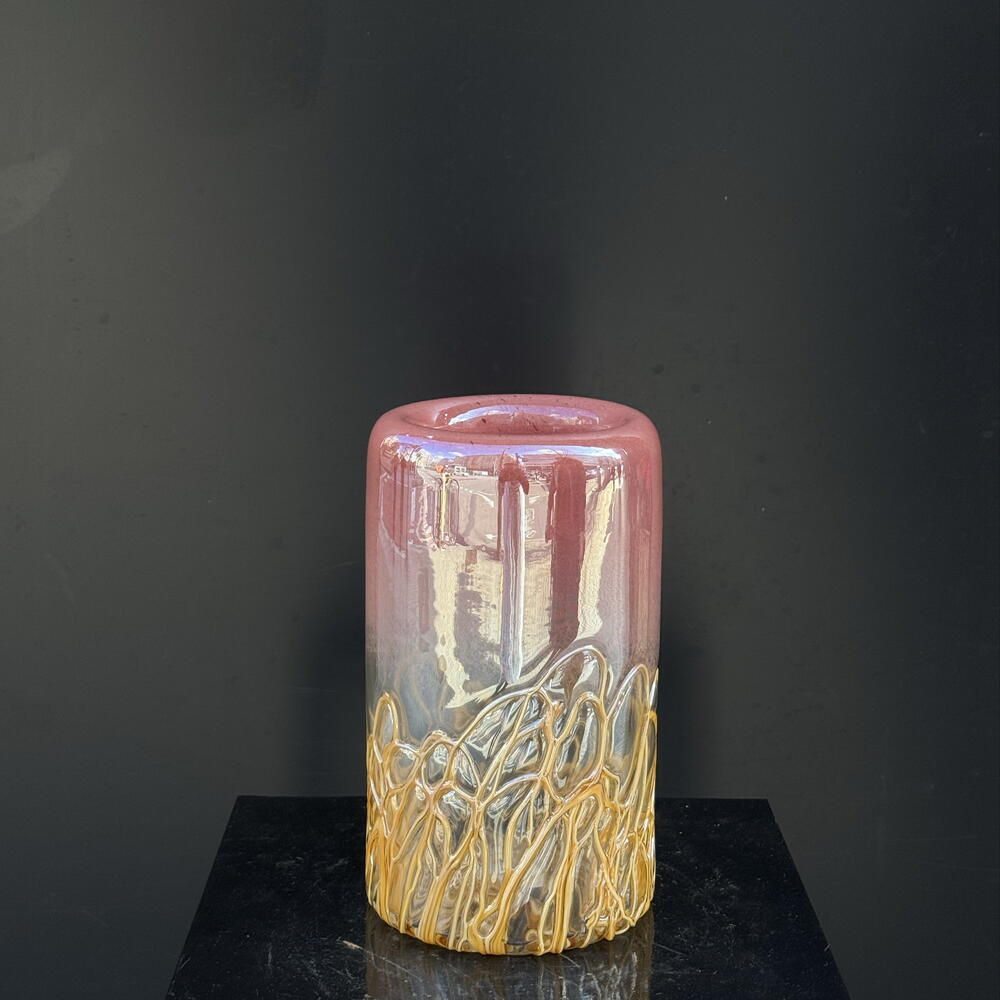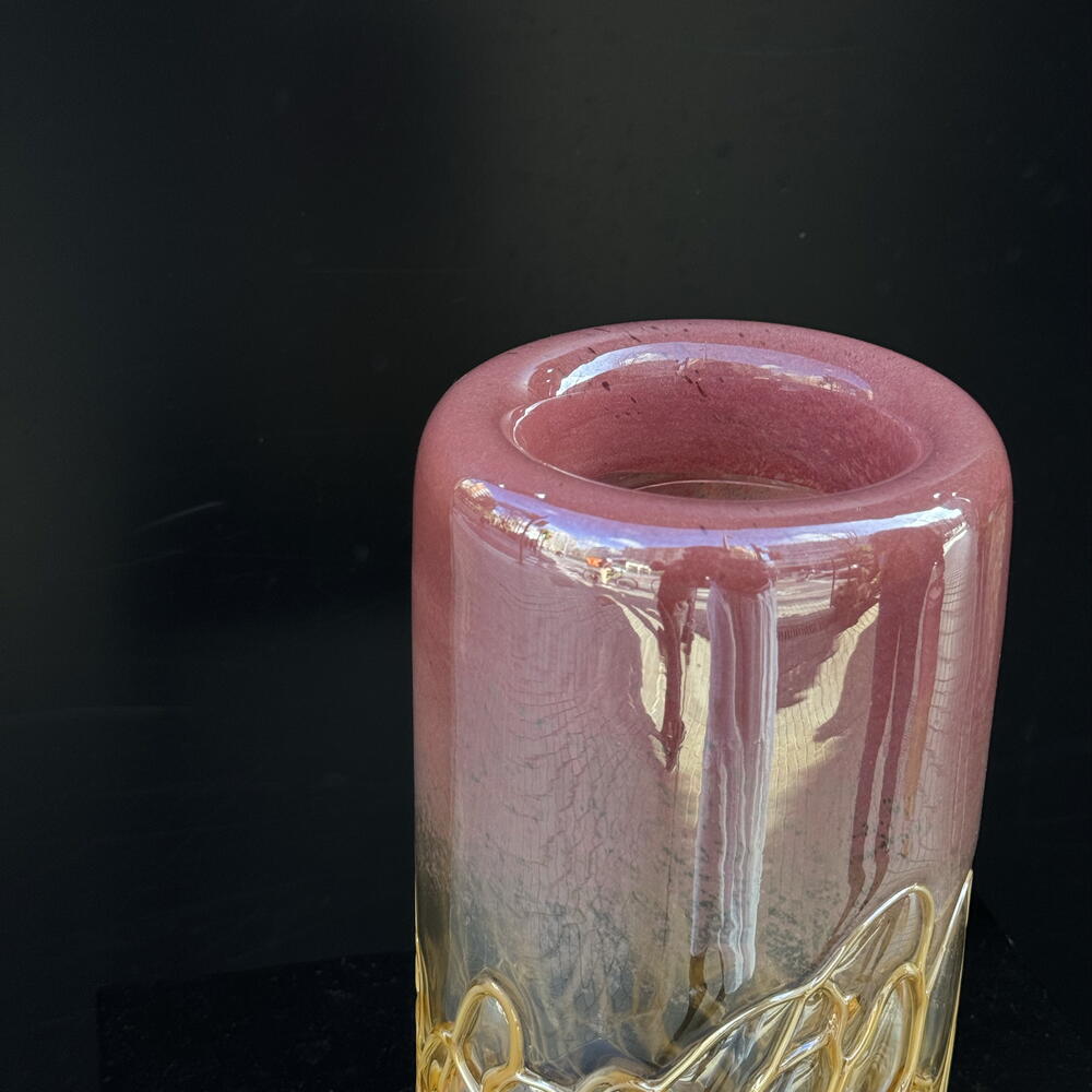 Jarrón artístico con degradado en tonos rosados y base decorada con líneas doradas en relieve que recuerdan a una cascada líquida. Una pieza moderna y expresiva que aporta calidez y carácter al espacio. ✨