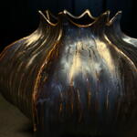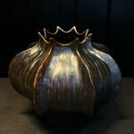 Jarrón de cerámica con forma orgánica inspirada en un capullo floral. Su acabado en tonos bronce y azul aporta un efecto artístico y sofisticado, creando una pieza decorativa única y elegante. Ideal para arreglos florales de estilo moderno o como objeto de diseño que destaca por sí solo en cualquier espacio.