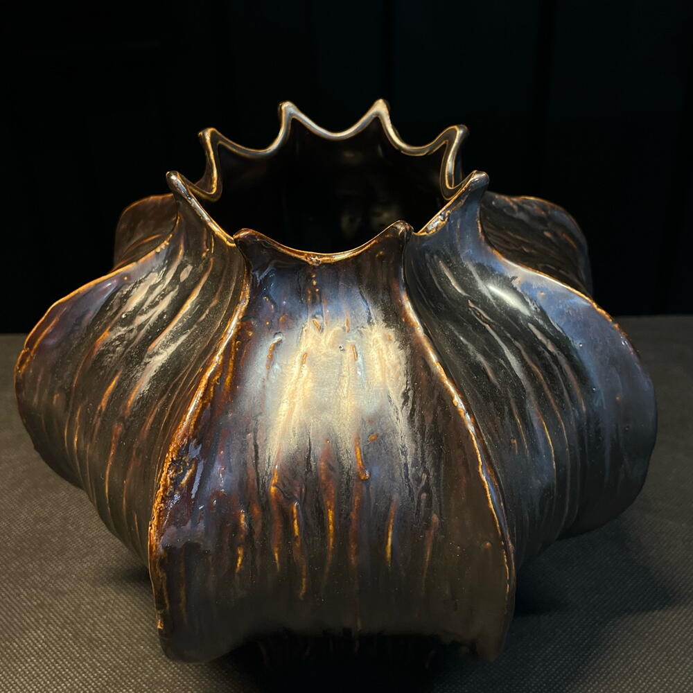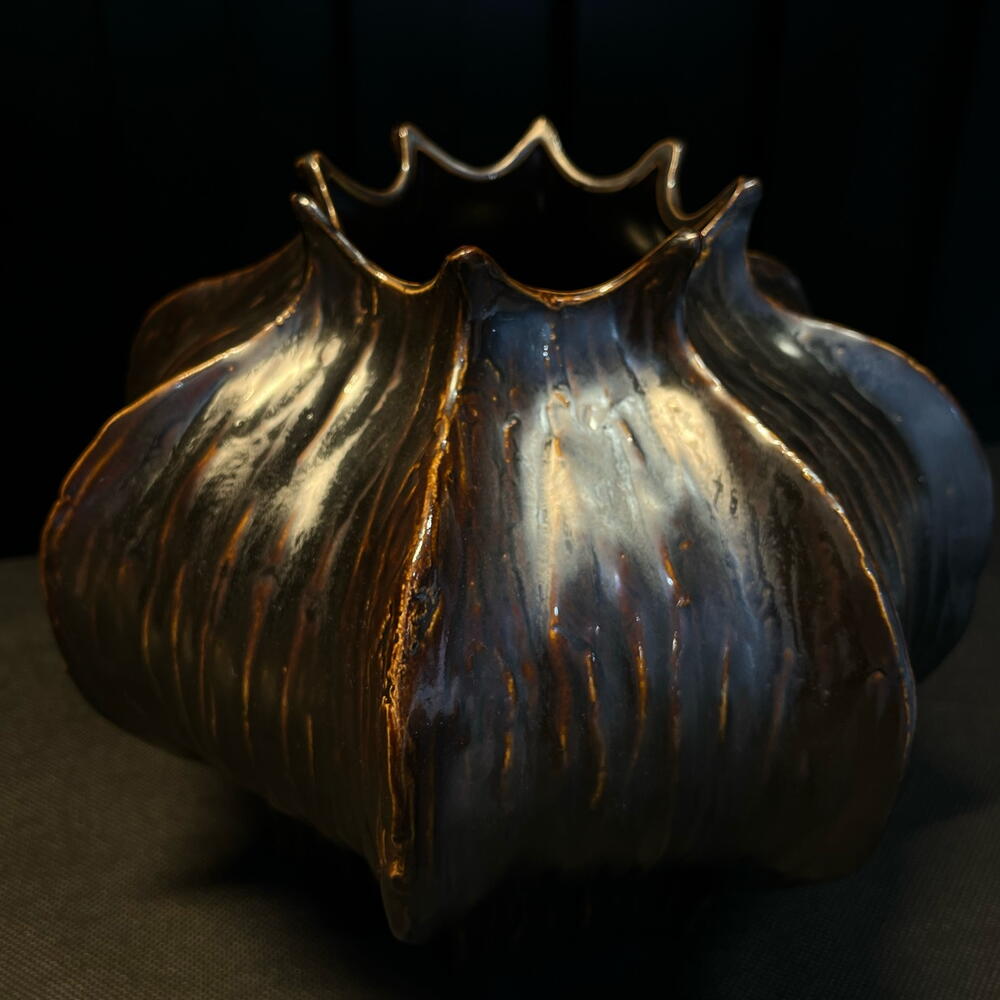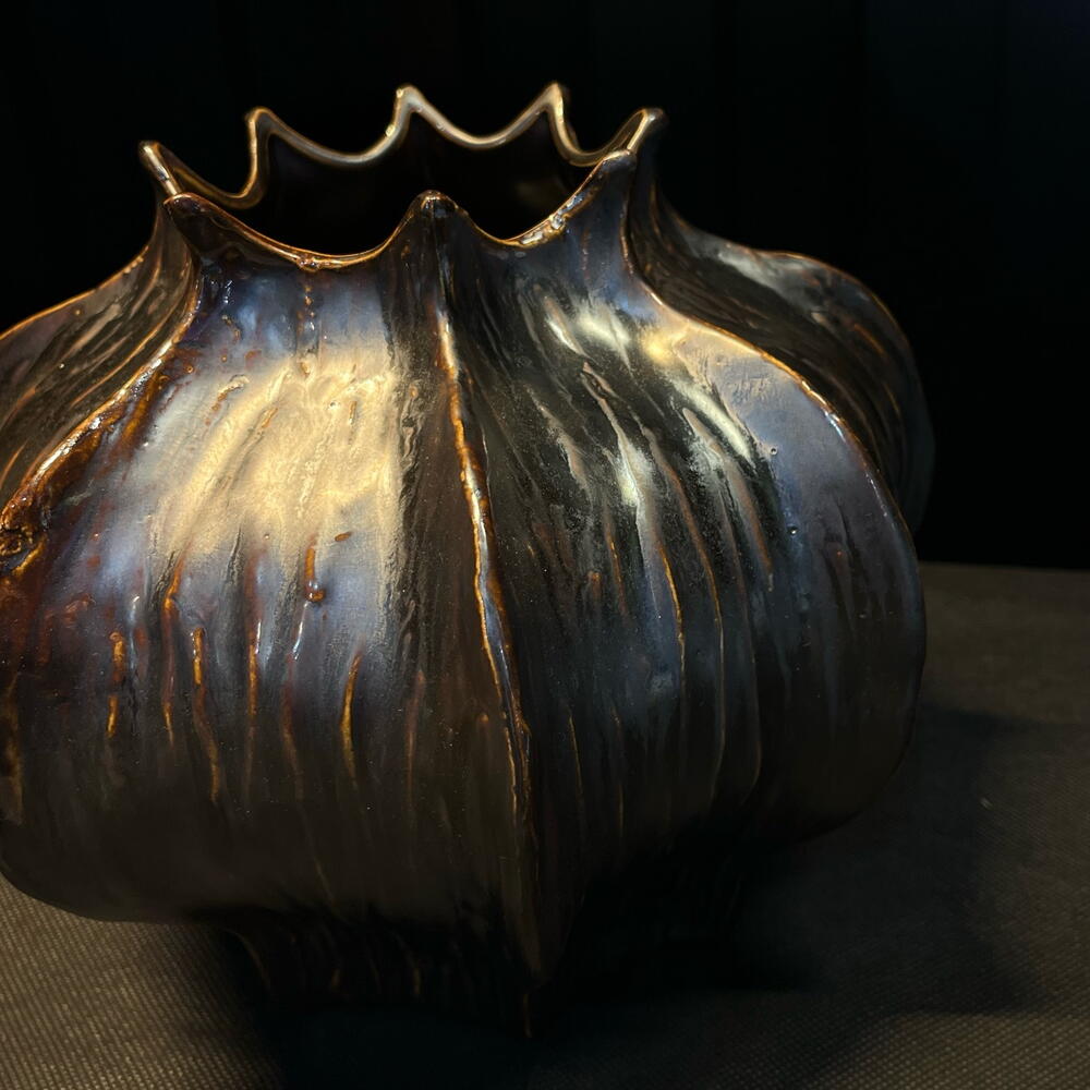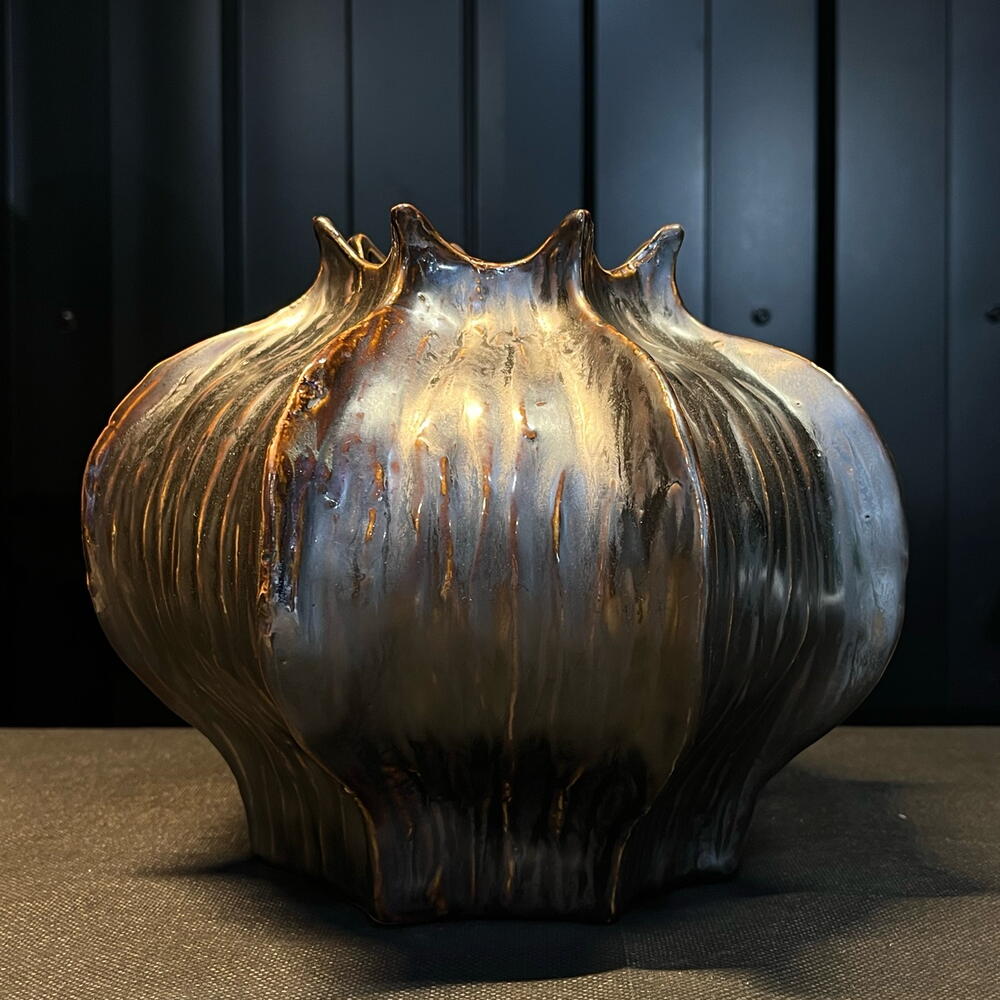 Jarrón de cerámica con forma orgánica inspirada en un capullo floral. Su acabado en tonos bronce y azul aporta un efecto artístico y sofisticado, creando una pieza decorativa única y elegante. Ideal para arreglos florales de estilo moderno o como objeto de diseño que destaca por sí solo en cualquier espacio.