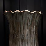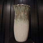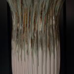 Jarrón decorativo de cerámica en tonos beige y verde. Tiene una forma alargada con textura vertical y acabado superior esmaltado. Adecuado para arreglos florales de tallo largo o como elemento decorativo en interiores. a.721