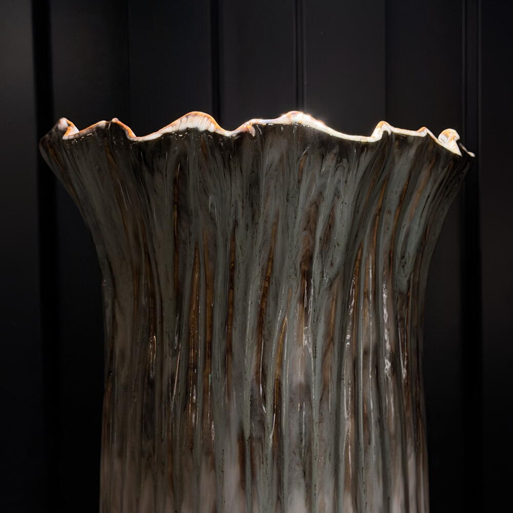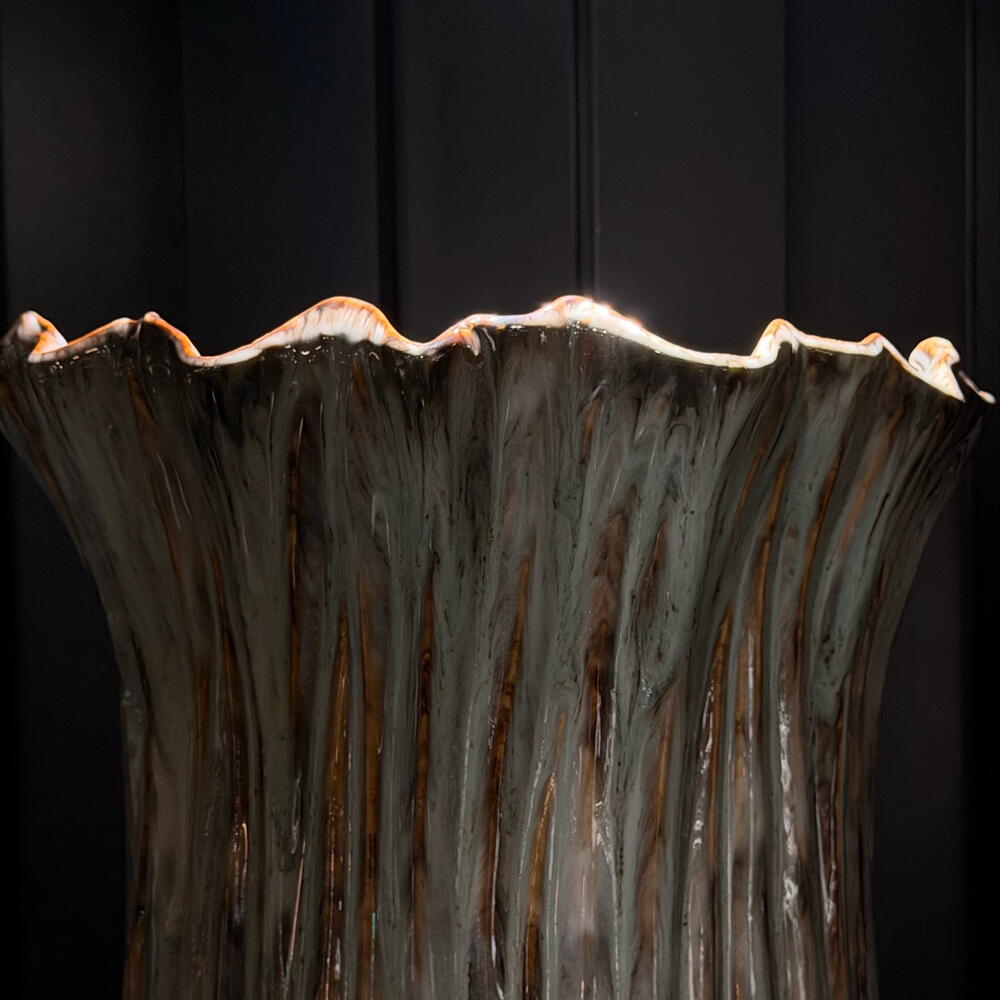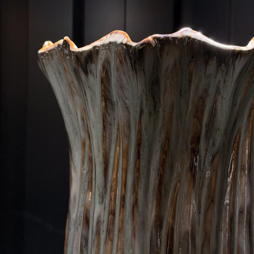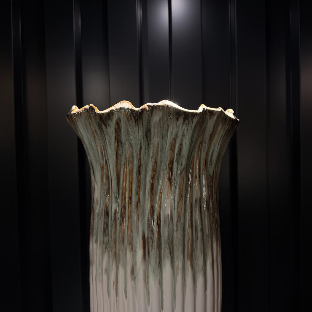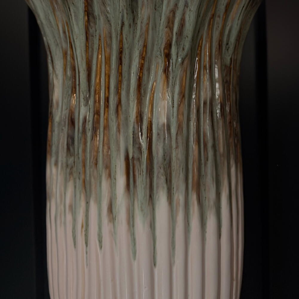 Jarrón decorativo de cerámica en tonos beige y verde. Tiene una forma alargada con textura vertical y acabado superior esmaltado. Adecuado para arreglos florales de tallo largo o como elemento decorativo en interiores. a.721