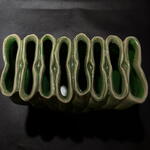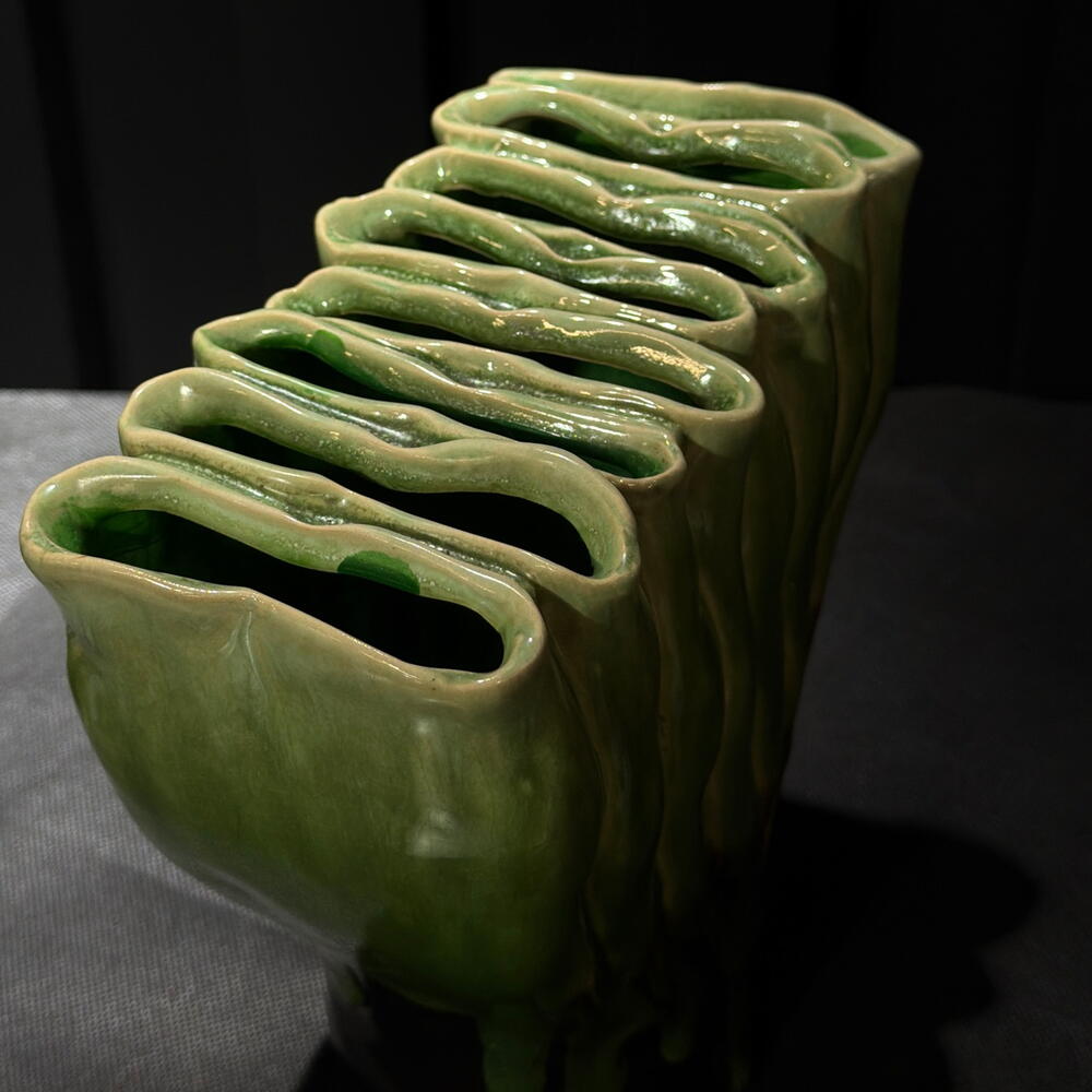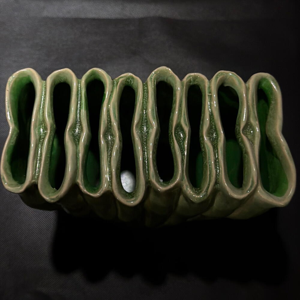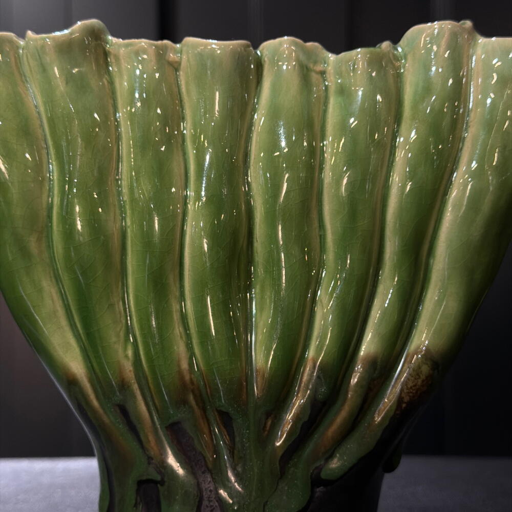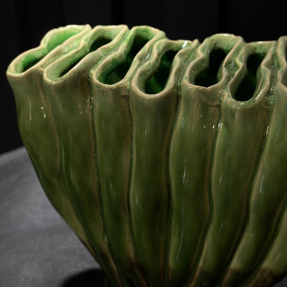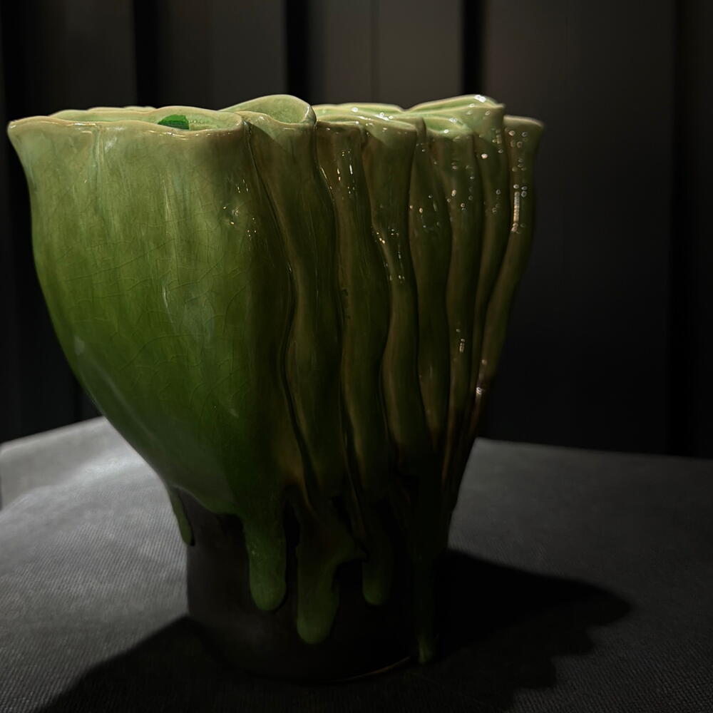 Florero grande de cerámica artesanal en verde Pieza decorativa de diseño orgánico, inspirada en formas naturales. El esmalte verde intenso con detalles oscuros crea un contraste elegante y muy llamativo. Perfecto para ramos medianos, plantas, arreglos florales o como elemento de diseño en interiores. a.460