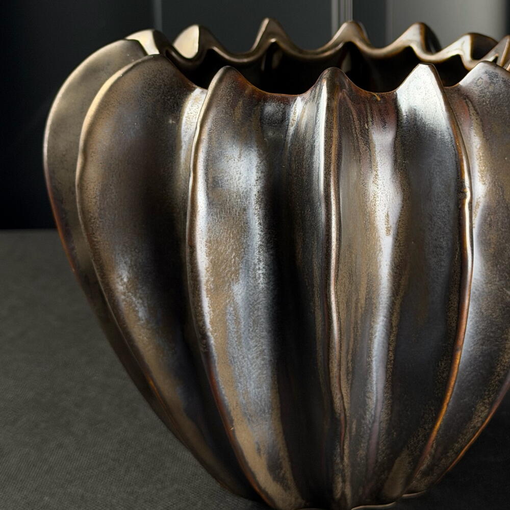 Jarrón de cerámica con acabado en tonos oscuros y detalles dorados, diseño orgánico y elegante, ideal para decoración interior y arreglos florales decorativos. a.966