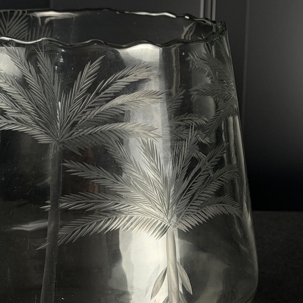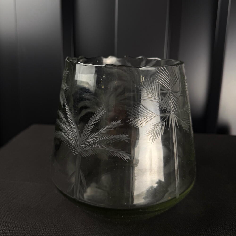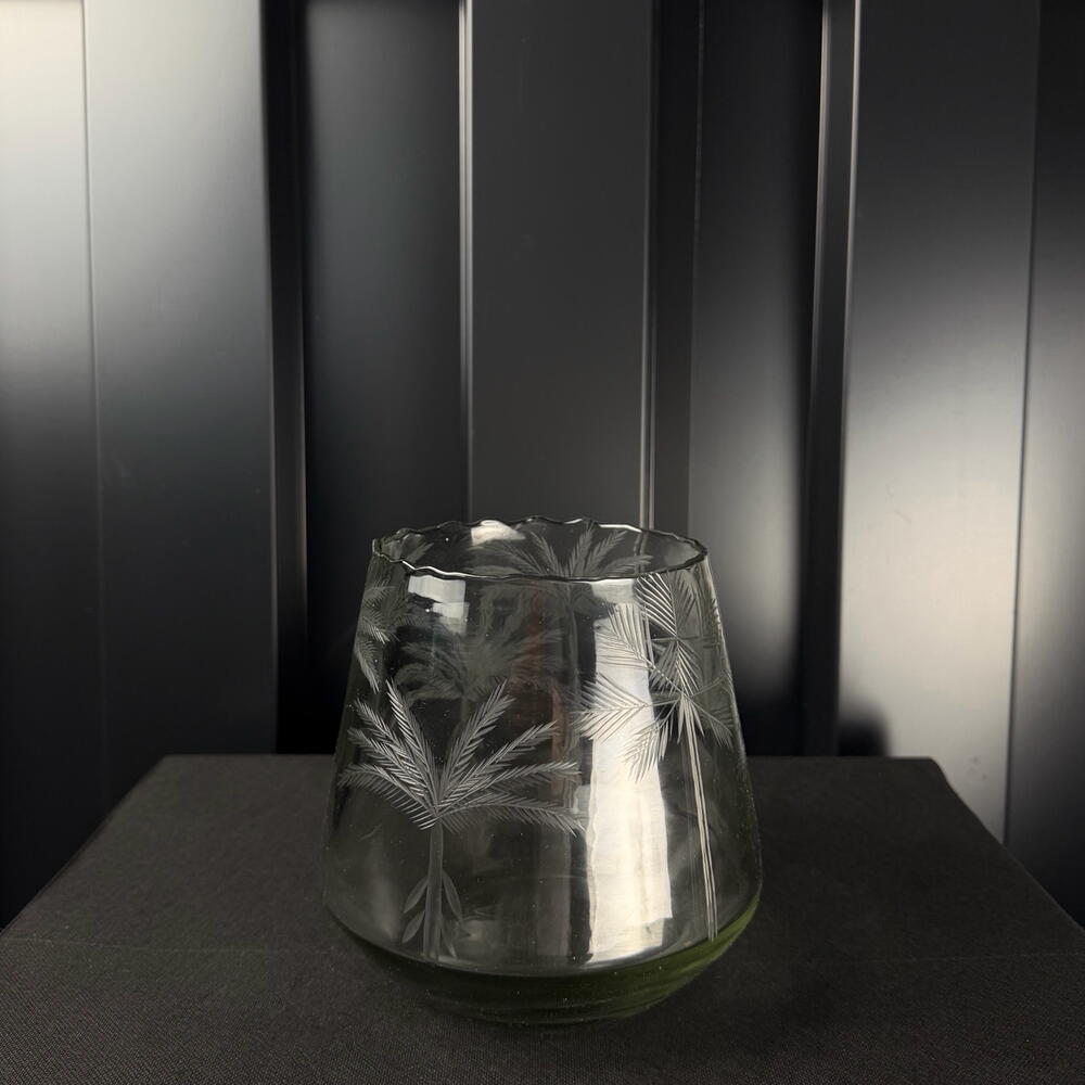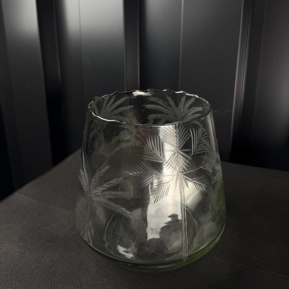 Jarrón de vidrio tallado con motivo de hojas, diseño elegante y natural, ideal para decoración interior y pequeños arreglos florales.