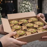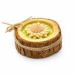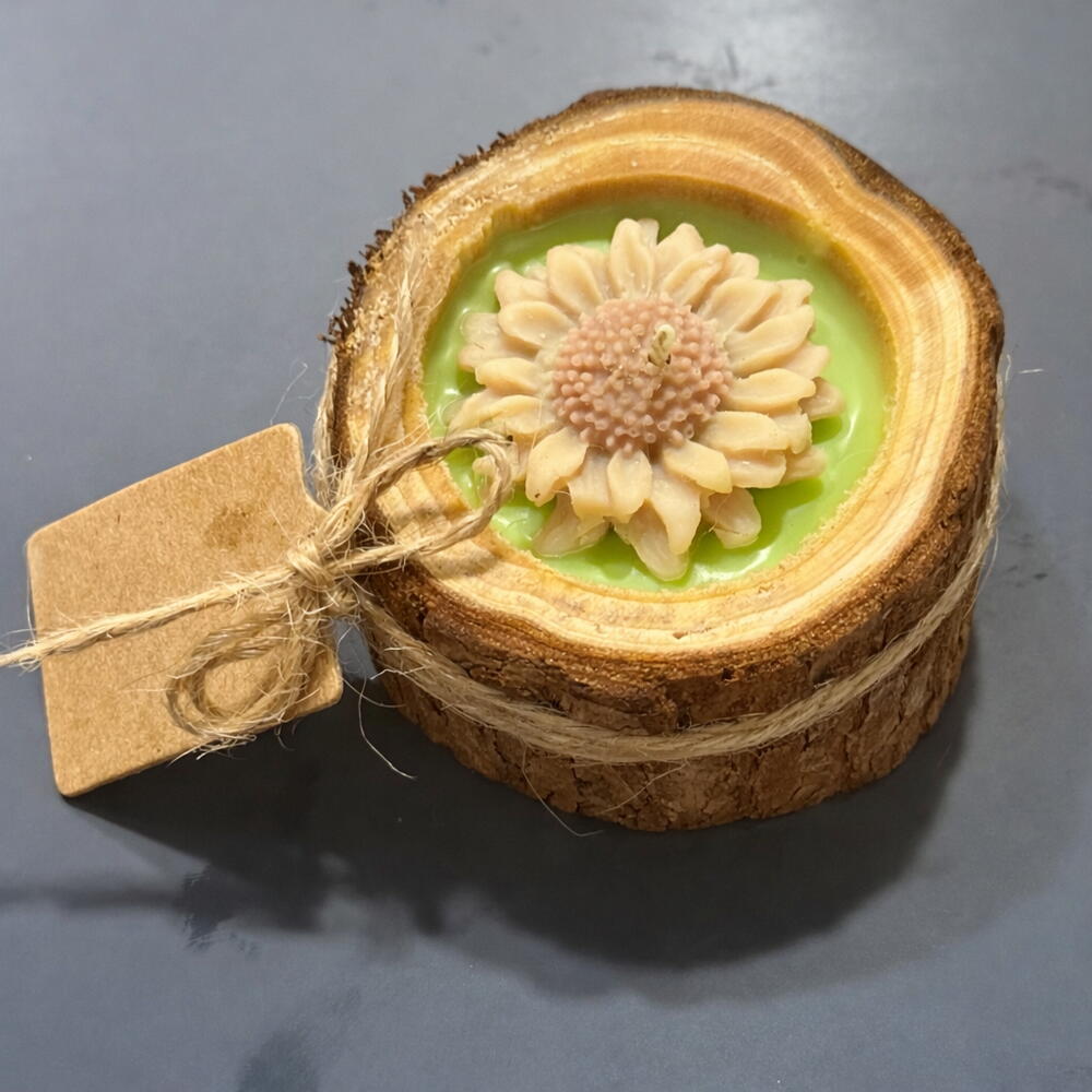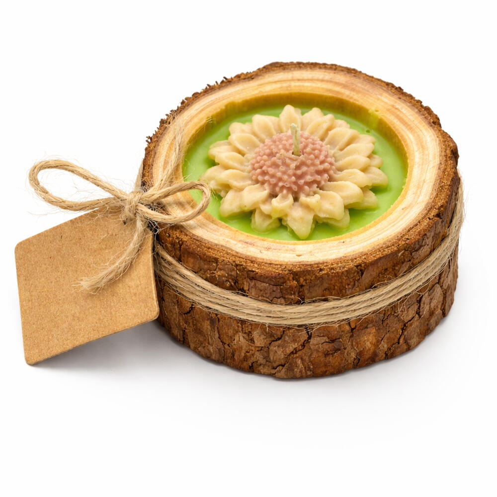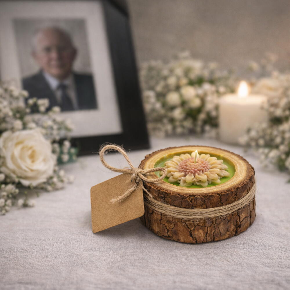 Vela recuerdo funerario elegante, floral y artesanal sobre madera natural. Personalizable en color, aroma y tarjeta conmemorativa