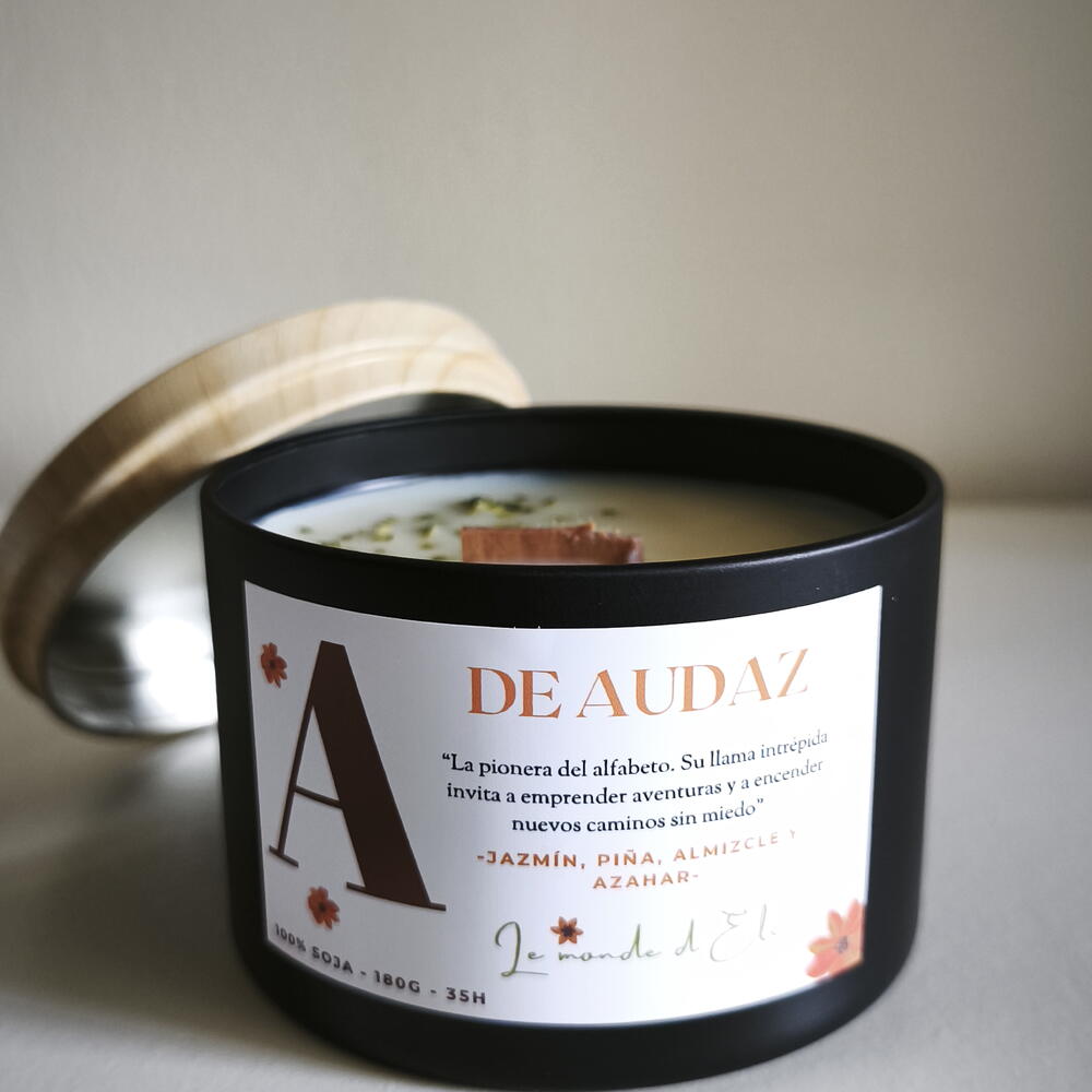 Vela aromática, A la pionera del alfabeto. Su llama intrépida invita a emprender aventuras y a encender nuevos caminos sin miedo. Aroma: Jazmín, piña, almizcle y azahar Peso total tamaño grande: 230g / Cera aprox.180g