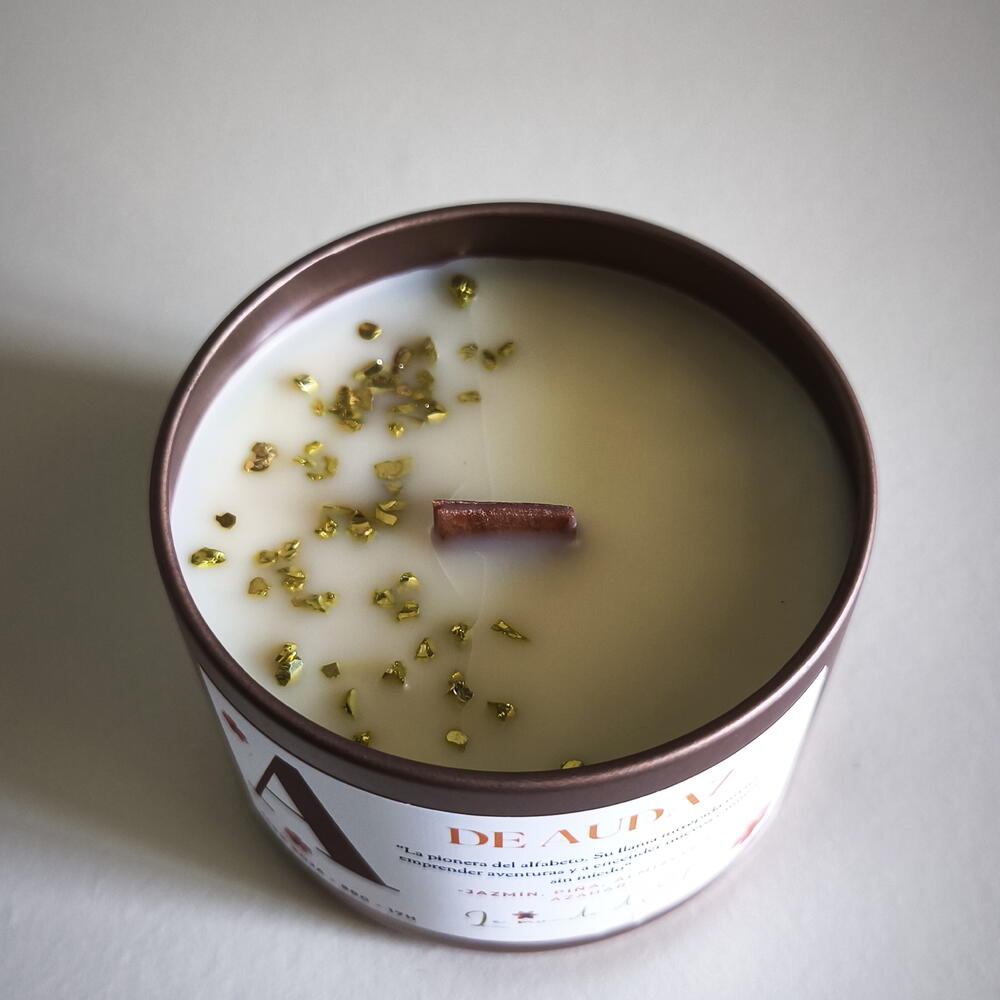 Vela aromática, A la pionera del alfabeto. Su llama intrépida invita a emprender aventuras y a encender nuevos caminos sin miedo. Aroma: Jazmín, piña, almizcle y azahar Peso total tamaño pequeño: 130g / Cera aprox.90g