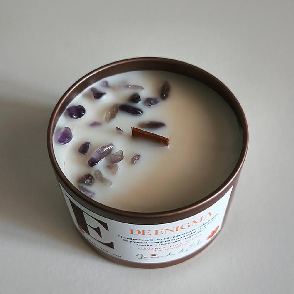 Vela aromática, la misteriosa E esconde secretos en cada destello. Su presencia despierta la curiosidad y te invita a descifrar su enigmático reslandor. Aroma: Lavanda, lima, salvia y eucalipto Peso total tamaño pequeño: 130g / Cera aprox.90g