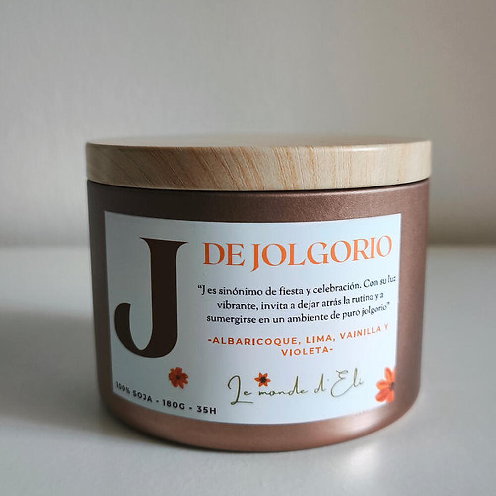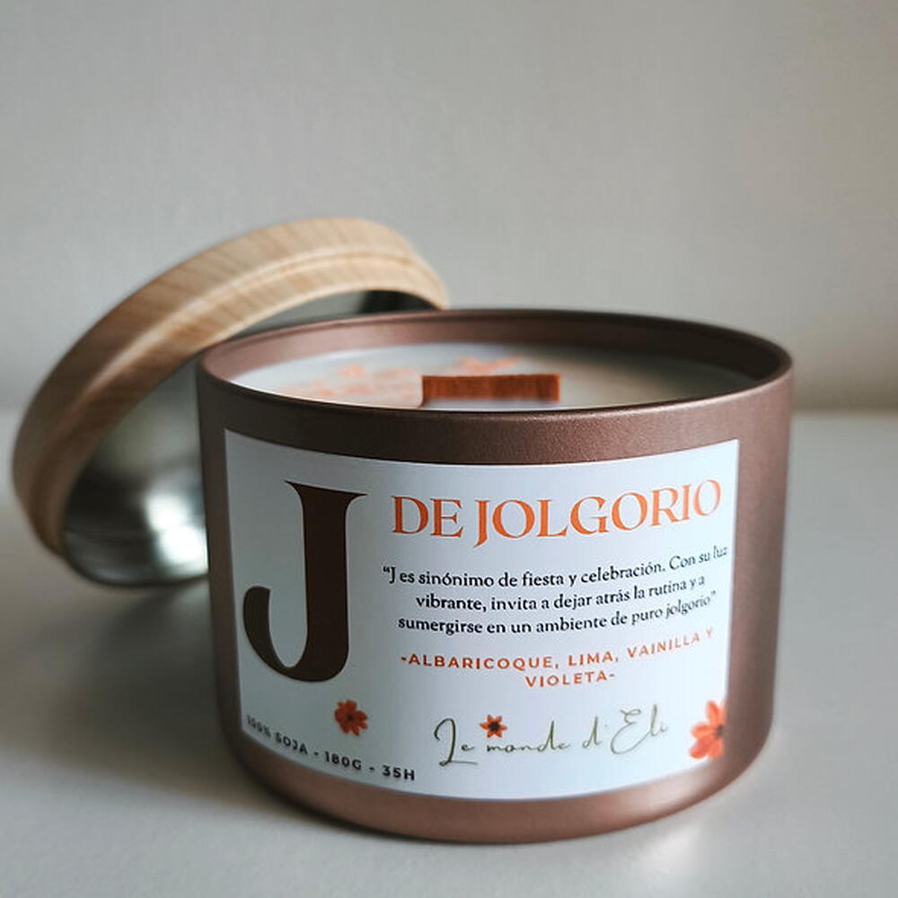 Vela aromática, J es sinónimo ded fiesta y celebración. Con su luz vibrante, invita a dejar atrás la rutina y a sumergirse en un ambiente de puro jolgorio. Aroma: Albaricoque, vainilla, lima y violeta Peso total tamaño grande: 230g / Cera aprox.180g