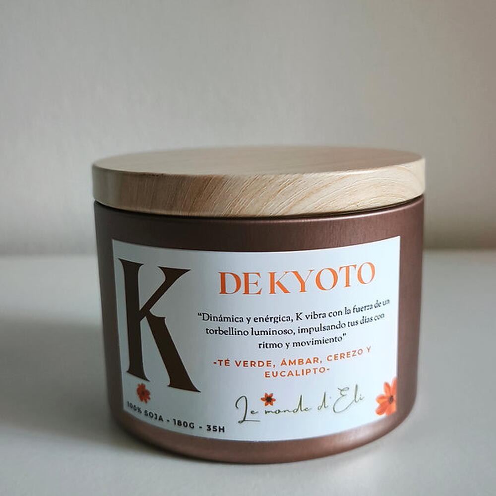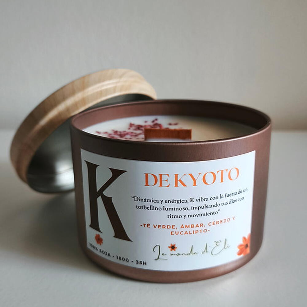 Vela aromática, K dinámica y enérgetica, vibra con la fuerza de un torbellino luminoso, impulsando tus dias con ritmo y movimiento. Aroma: Te verde, ámbar, eucalipto y cerezo Peso total tamaño grande: 230g / Cera aprox.180g