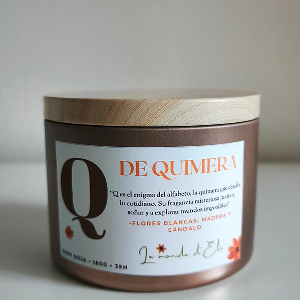 Vela aromática, Q es el enigma del alfabeto, la quimera que desafia lo cotidiano. Su fragancia misteriosa invita a soñar y a explorar mundos imposibles. Aroma: Flores blancas, madera y sándalo Peso total tamaño grande: 230g / Cera aprox.180g