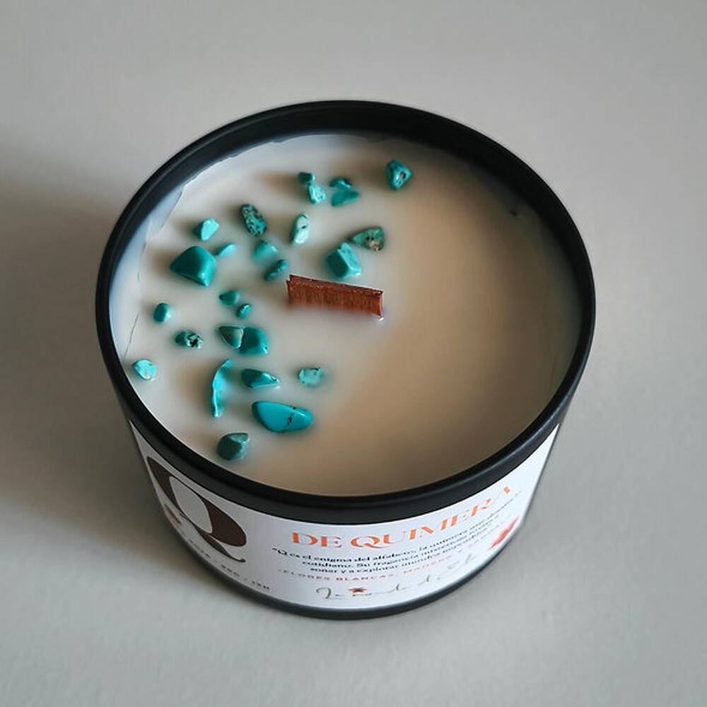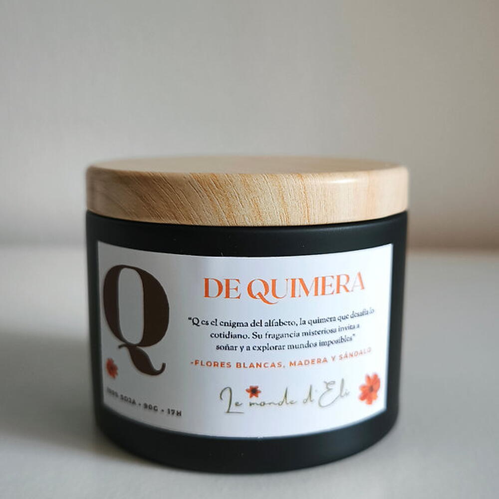 Vela aromática, Q es el enigma del alfabeto, la quimera que desafia lo cotidiano. Su fragancia misteriosa invita a soñar y a explorar mundos imposibles. Aroma: Flores blancas, madera y sándalo Peso total tamaño pequeño: 130g / Cera aprox.90g