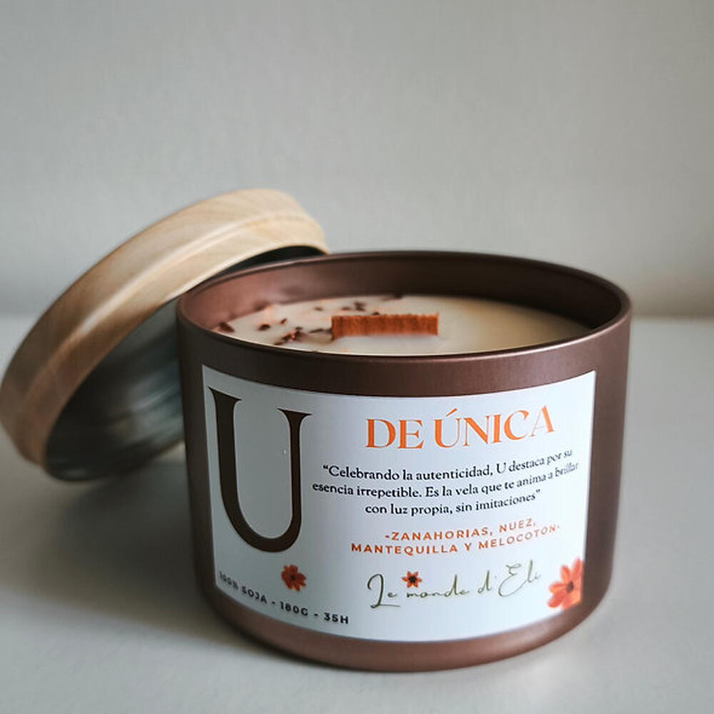 Vela aromática, celebrando la autenticidad, U destaca por tu esencia irrepetible. Es la vela que te anima a brillar con luz propia, sin imitaciones. Aroma: Zanahoria, nuez, mantequilla y melocotón Peso total tamaño grande: 230g / Cera aprox.180g