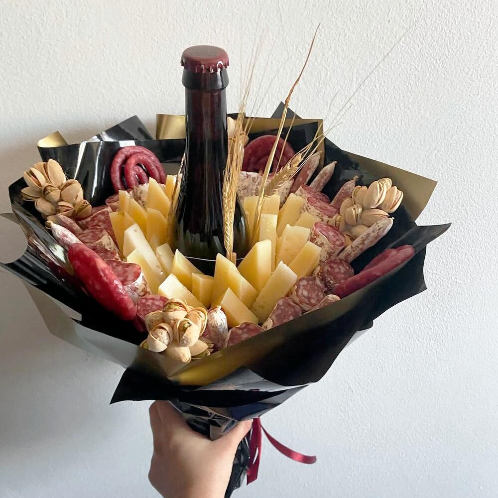 Un ramo gourmet con carácter, ideal para los amantes de los sabores intensos y las presentaciones originales. Compuesto por una botella de cerveza artesanal en el centro, rodeada de cuñas de queso curado, embutidos variados (fuet, salami, chorizo), pistachos y espigas de trigo para un toque rústico y decorativo. Envuelto en elegante papel negro con detalles dorados, este bouquet es perfecto para regalar en celebraciones, aniversarios o como detalle especial para los apasionados de la buena mesa. Se recomienda conservar el queso y los embutidos en refrigeración hasta el momento de consumo.