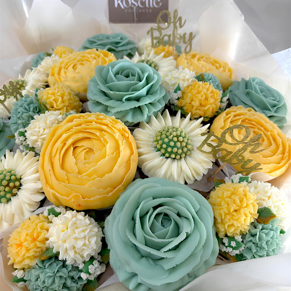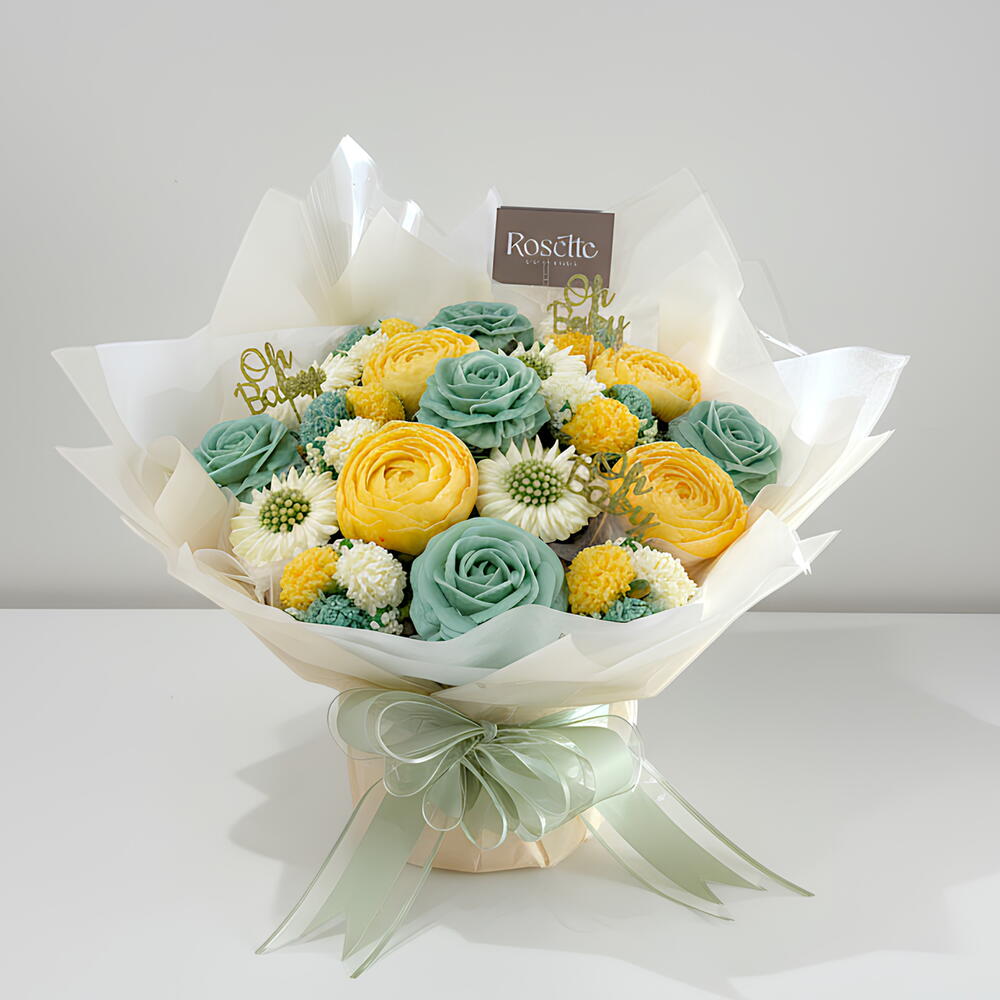 Un encantador ramo de 19 cupcakes decorados con rosas verde menta, flores en tonos amarillo suave y crema, acompañado de detalles dulces perfectos para celebrar la llegada de un bebé. Una composición tierna, luminosa y elegante, ideal para baby showers, regalos de maternidad o para dar una bienvenida especial y memorable. Sabores a elegir: vainilla, chocolate, red velvet o zanahoria. Por favor, indica en la nota a la tienda el sabor o combinación de sabores que prefieres. Cupcake Red Velvet Ingredientes: Bizcocho (67%) [azúcar, huevo pasteurizado (conservante E202, acidulante E330), mantequilla (nata, cultivos del ácido láctico, concentrado del ácido láctico, sal), harina de trigo, leche pasteurizada, cacao en polvo, vinagre de vino blanco (sulfitos), levadura química (gasificantes E500ii y E450i, harina de arroz, estabilizante E341i), extracto de vainilla (azúcar invertido, extracto de vainilla Bourbon, vainas de vainilla, espesante goma xantana), gasificante (bicarbonato sódico), colorante rojo (humectante E422, agua, colorantes E122*, E129*, E133, almidón modificado de tapioca)]; decoración [azúcar glacé (azúcar, almidón de maíz), mantequilla (nata, cultivos del ácido láctico, concentrado del ácido láctico, sal), agua, colorantes alimenticios (humectante E422, espesante E551, agua, colorantes E102*, E110*, E122*, E129*, E133, almidón modificado de tapioca)]. *E122 y E129 pueden tener efectos negativos sobre la actividad y la atención de los niños. Alérgenos: Contiene gluten, huevo, leche y sulfitos. Puede contener trazas de soja, frutos de cáscara (almendras, avellanas, nueces, anacardos, pacanas, pistachos, macadamia, nueces de Australia), sésamo y mostaza. Cupcake Vainilla Ingredientes: Bizcocho (67%) [mantequilla (nata, cultivos del ácido láctico, concentrado del ácido láctico, sal), azúcar, harina de trigo, huevo pasteurizado (conservante E202, acidulante E330), levadura química (gasificantes E500ii y E450i, harina de arroz, estabilizante E341i), extracto de vainilla (0,56%) (azúcar invertido, extracto de vainilla Bourbon, vainas de vainilla, espesante goma xantana)]; decoración [azúcar glacé (azúcar, almidón de maíz), mantequilla (nata, cultivos del ácido láctico, concentrado del ácido láctico, sal), agua, colorantes alimenticios (humectante E422, espesante E551, agua, colorantes E102*, E110*, E122*, E129*, E133, almidón modificado de tapioca)]. *E122 y E129 pueden tener efectos negativos sobre la actividad y la atención de los niños. Alérgenos: Contiene gluten, huevo y leche. Puede contener trazas de soja y mostaza. Cupcake Chocolate Ingredientes: Bizcocho (67%) [mantequilla (nata, cultivos del ácido láctico, concentrado del ácido láctico, sal), azúcar, harina de trigo, huevo pasteurizado (conservante E202, acidulante E330), cacao en polvo (5,11%), levadura química (gasificantes E500ii y E450i, harina de arroz, estabilizante E341i), agua, leche pasteurizada, extracto de vainilla (azúcar invertido, extracto de vainilla Bourbon, vainas de vainilla, espesante goma xantana), café soluble, vinagre de vino blanco (sulfitos)]; decoración [azúcar glacé (azúcar, almidón de maíz), mantequilla (nata, cultivos del ácido láctico, concentrado del ácido láctico, sal), agua, colorantes alimenticios (humectante E422, espesante E551, agua, colorantes E102*, E110*, E122*, E129*, E133, almidón modificado de tapioca)]. *E122, E110 y E129 pueden tener efectos negativos sobre la actividad y la atención de los niños. Alérgenos: Contiene gluten, huevo, leche y sulfitos. Puede contener trazas de soja, frutos de cáscara, sésamo y mostaza. Cupcake Zanahoria Ingredientes: Bizcocho (67%) [zanahoria (18,41%), harina de trigo, huevo pasteurizado (conservante E202, acidulante E330), azúcar, aceite refinado de girasol, leche pasteurizada, levadura química (gasificantes E500ii y E450i, harina de arroz, estabilizante E341i), ralladura de naranja, ralladura de limón, canela y extracto de vainilla (azúcar invertido, extracto de vainilla Bourbon, vainas de vainilla, espesante goma xantana)]; decoración [azúcar glacé (azúcar, almidón de maíz), mantequilla (nata, cultivos del ácido láctico, concentrado del ácido láctico, sal), agua, colorantes alimenticios (humectante E422, espesante E551, agua, colorantes E102*, E110*, E122*, E129*, E133, almidón modificado de tapioca)]. *E122 y E129 pueden tener efectos negativos sobre la actividad y la atención de los niños. Alérgenos: Contiene gluten, huevo y leche. Puede contener trazas de soja y mostaza.